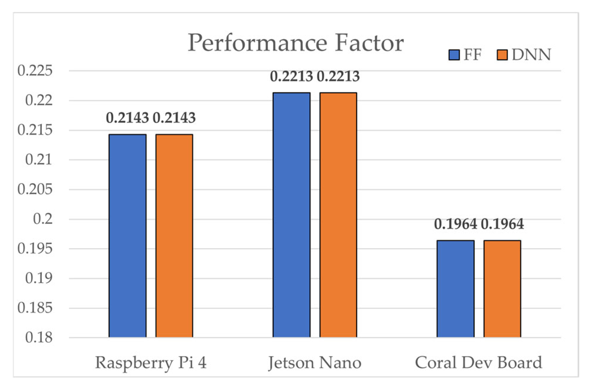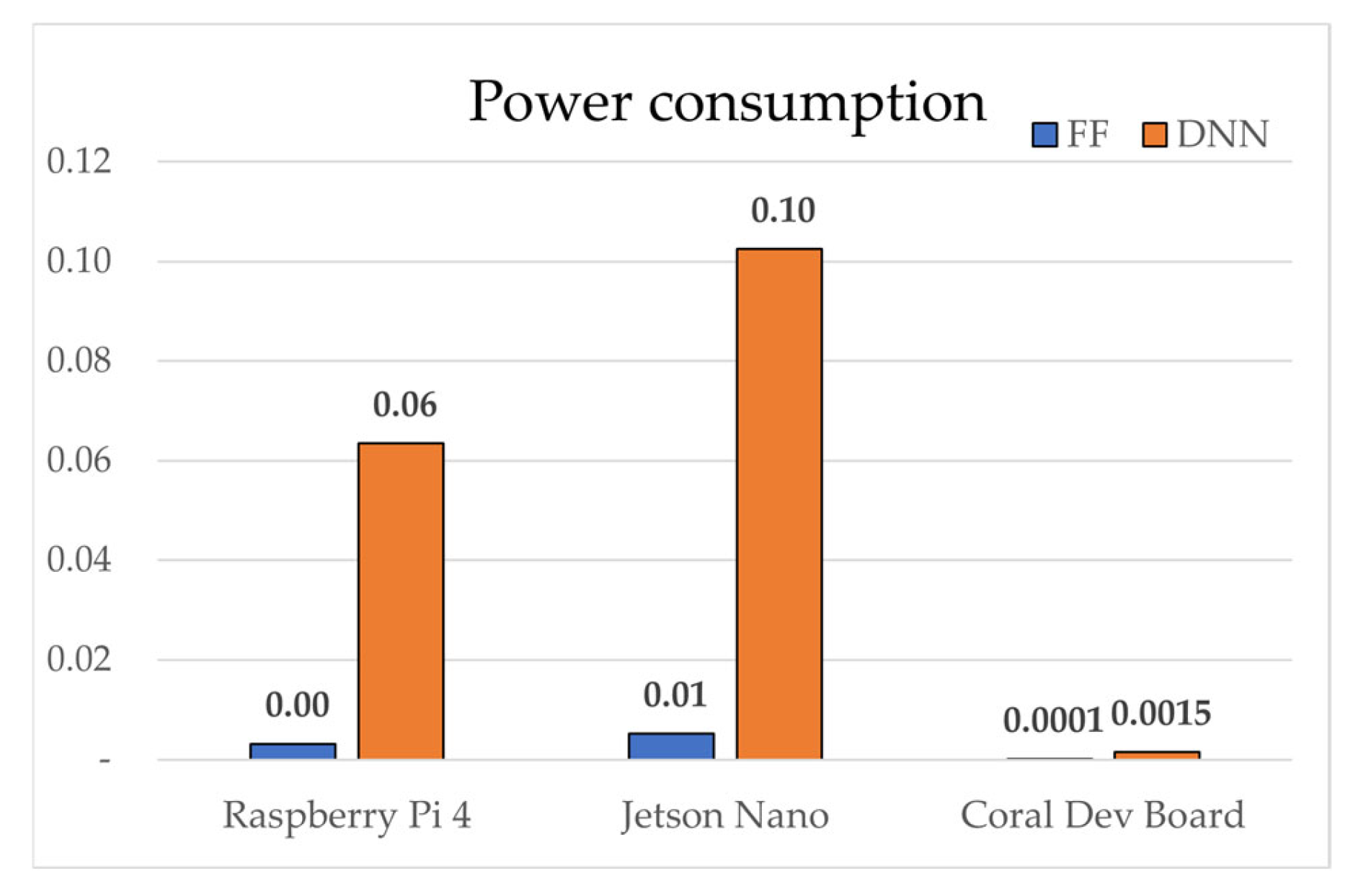 Energy consumption was additionally estimated as the product of device power (W) and inference time (s), though this was not directly integrated into the EPES formula. Model size was excluded, as both FF and DNN had sizes in the kilobyte range, providing limited discriminative value.