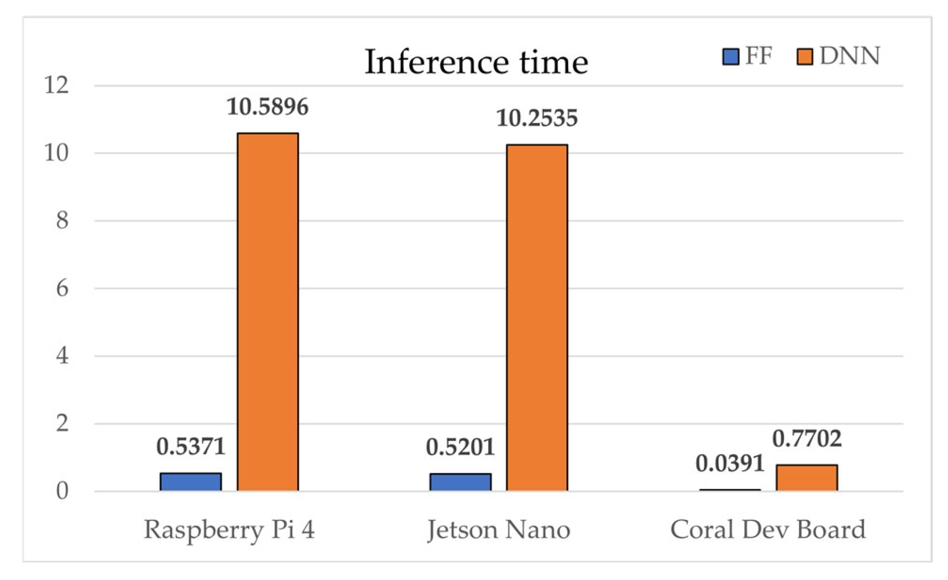 To evaluate the performance of the proposed SAE-FF and SAE-DNN lightweight classifiers in a realistic setting, inference tests were conducted on three edge devices: the Raspberry Pi 4 [