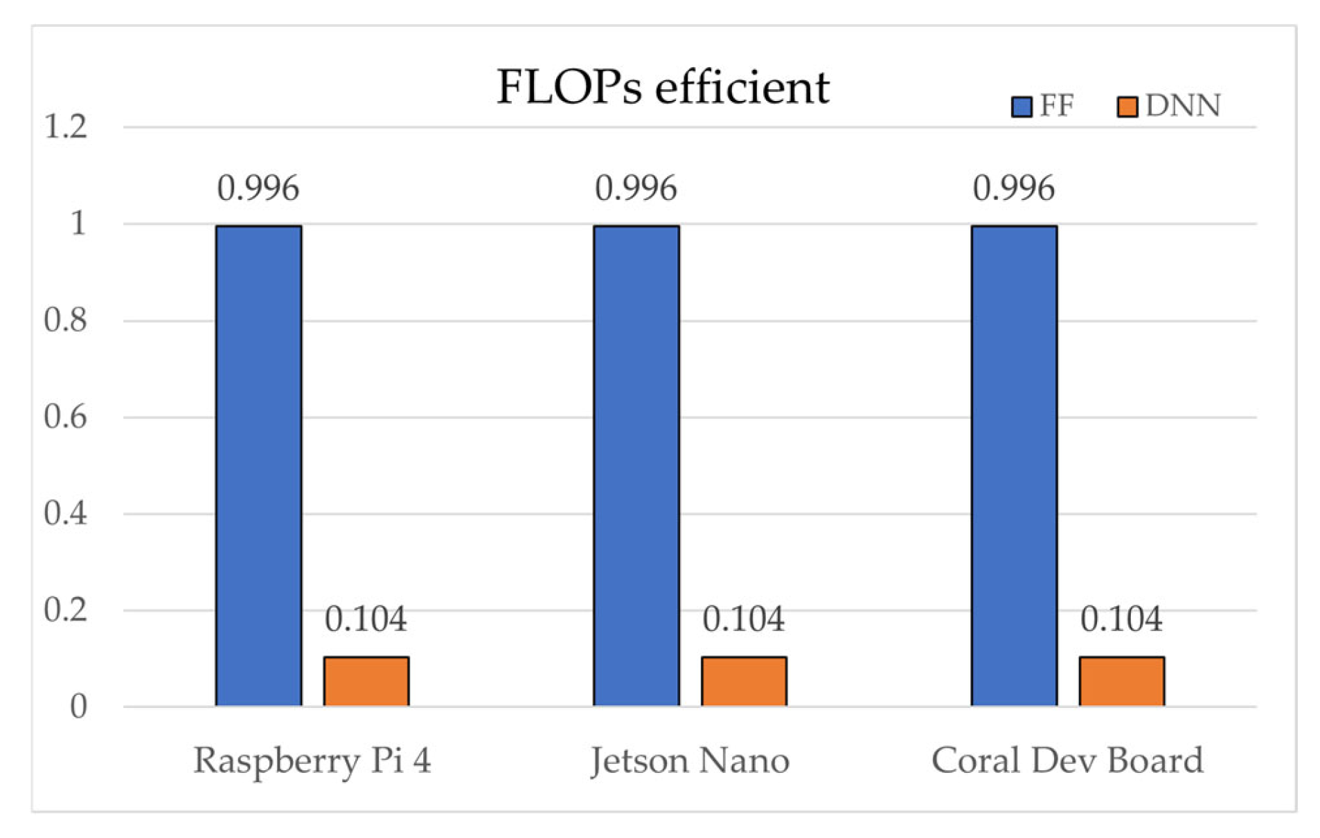 Device performance factors, measured relative to an Intel i7-7700K baseline, ranked as follows: Jetson Nano (0.2213) > Raspberry Pi 4 (0.2143) > Coral Dev Board (0.1964). In FLOPs efficiency, SAE-FF required 224 times fewer operations (40 vs. 8960), achieving an efficiency score of 0.9960. Inference latency was consistently shorter for SAE-FF because of its two-layer structure. On the Coral Dev Board, Edge TPU acceleration enabled 0.039 ms inference for SAE-FF and 0.770 ms for SAE-DNN. On the Raspberry Pi 4, the gap widened to ~19.7× (0.537 ms vs. 10.590 ms). Model sizes were ≈0.1 KB for SAE-FF and ≈18.6 KB for SAE-DNN.