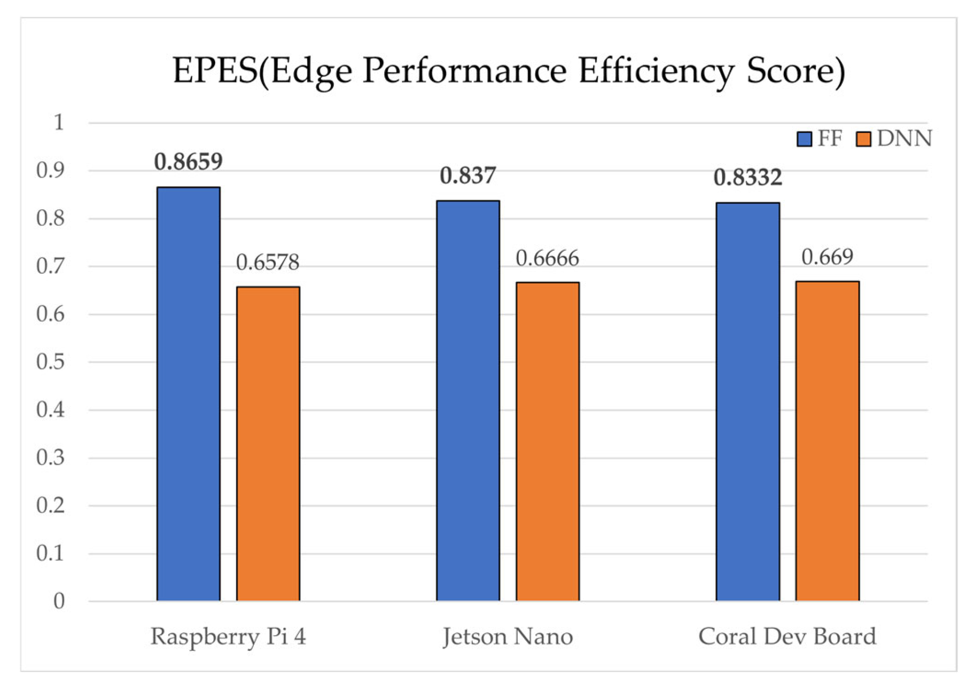 This study introduces the EPES to provide a unified metric for evaluating the deployability of models on edge devices. EPES consolidates both classification performance and computational efficiency into a single value, enabling fair comparison between models such as FF and DNN when applied in constrained environments. The score comprises five components—accuracy, inference speed, FLOPs, memory efficiency, and CPU performance factor—each normalized and weighted according to their relative importance (see