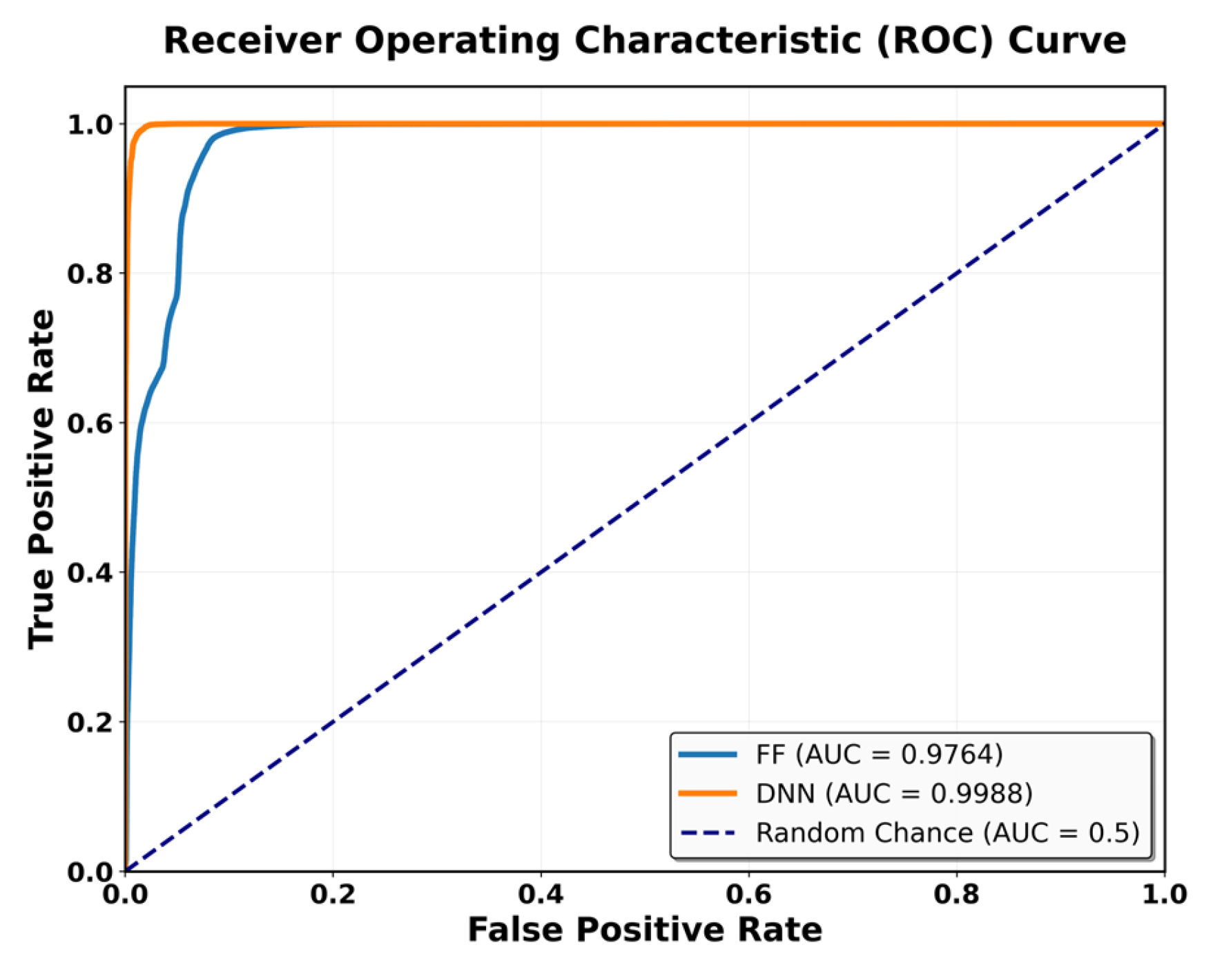 Figure 10 shows the ROC curves for the two classifiers. Both models outperform random guessing (AUC = 0.5). The SAE-DNN curve closely follows the upper left boundary, demonstrating very high recall and precision.