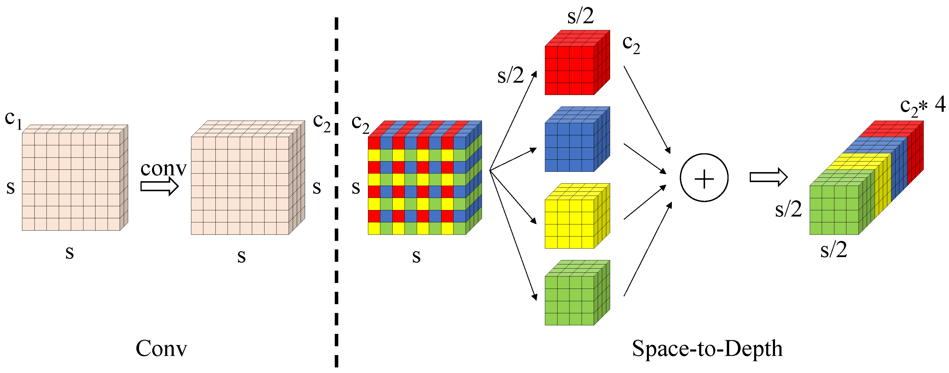 Given an input feature map of size with channels, the transformation begins with non-strided convolution layers that expand the channel dimension to while maintaining the original spatial resolution . Subsequently, the core space-to-depth operation applies a scaling factor s (typically ) to partition the spatial domain. This decomposition splits the feature map into spatial sub-windows, each of size . These sub-maps are then concatenated along the channel dimension, producing an intermediate representation of size .