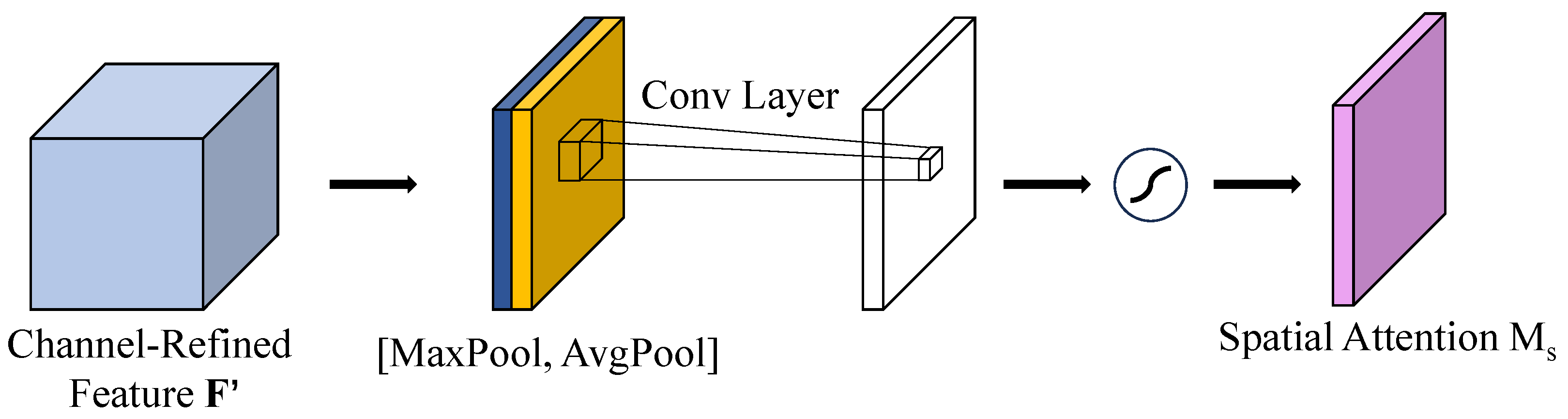 Figure 5. This module employs a spatial feature aggregation strategy. The input feature maps are first processed through parallel channel-wise max pooling and average pooling operations, which extract extreme features with prominent spatial variations and statistical features, respectively, resulting in two complementary spatial response maps. The obtained descriptors are combined through concatenation and a spatial attention map is then derived by applying convolutional operations. Following normalization using the Sigmoid function, the obtained weights constrained within the range of [0, 1] are integrated into the input feature map through element-wise multiplication, thereby adaptively enhancing spatial characteristics. By combining both extreme and statistical spatial features, the approach refines the performance of the model to discern tiny defects against complex backgrounds, thus enhancing precision in identifying diminutive targets.