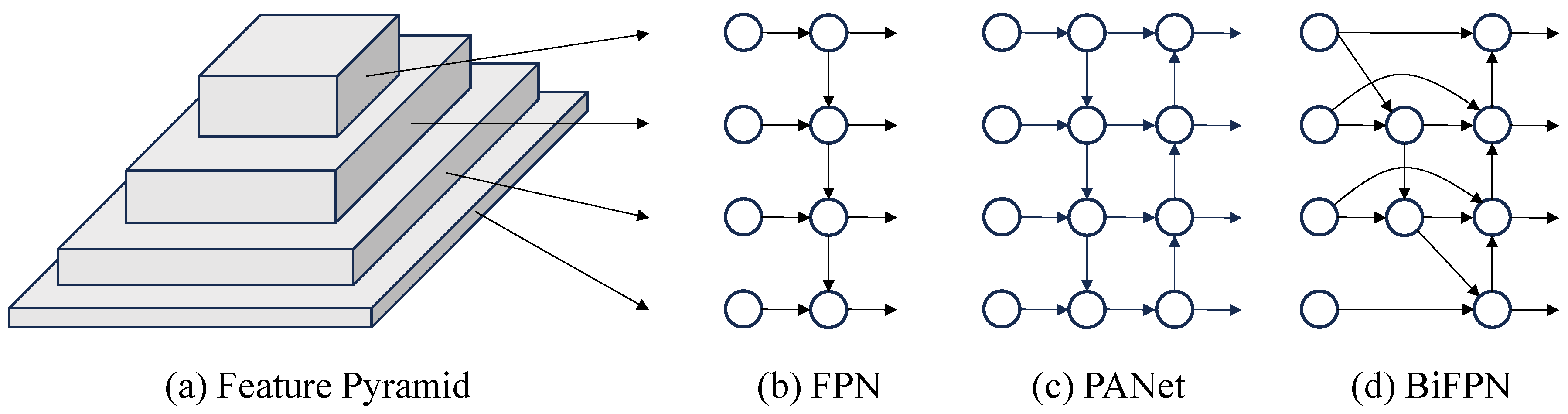 Figure 6b,c, respectively. These architectures incorporate top–down pathways along with lateral connections to facilitate multi-scale feature fusion, thereby efficiently narrowing the semantic disparity between deeper and shallower network layers. FPN improves upon conventional feature extraction by preserving the bottom-up backbone and introducing a top–down pathway that integrates low-layer spatial details with high-layer semantic message via lateral connections. It allows the network to maintain rich semantic understanding while achieving accurate spatial localization. Building upon FPN, PANet introduces a bottom-up path to form a bidirectional enhancement strategy. By feeding low-level geometric details back into higher layers, PANet constructs a closed-loop optimization mechanism that improves semantic consistency in shallow features and enhances the localization accuracy of deeper layers. This dual-path design achieves a dynamic balance between semantic abstraction and spatial precision.