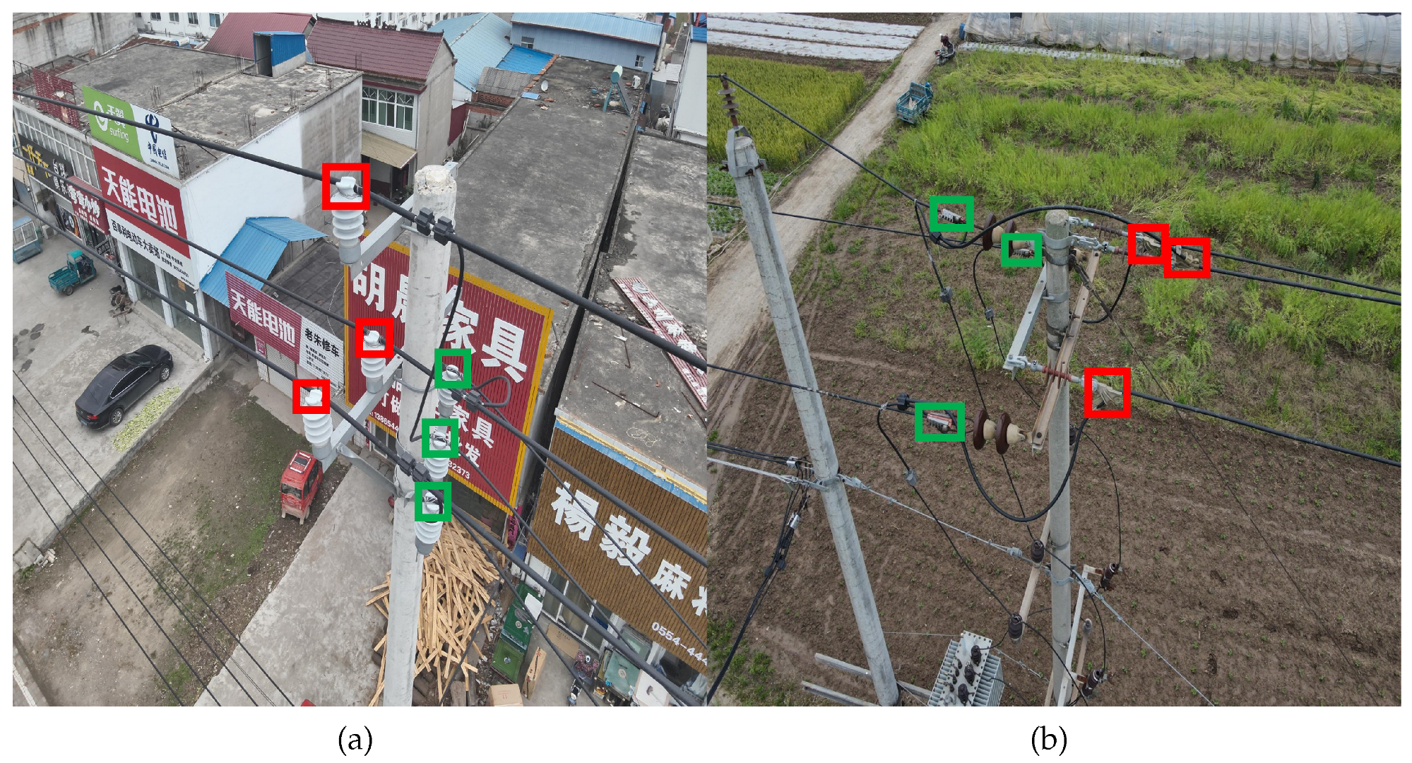 Figure 10a, red boxes indicate ‘non-standard binding’ defects, while green boxes denote ‘standardized binding’. Normally, distribution cables should be placed and bundled in the grooves of the insulator to ensure that the insulator can support the distribution cable and provide electrical insulation. When the lashing is not standardized, the insulator cannot provide support and electrical protection for the cable, and it cannot guarantee reliable operation of the distribution line. In