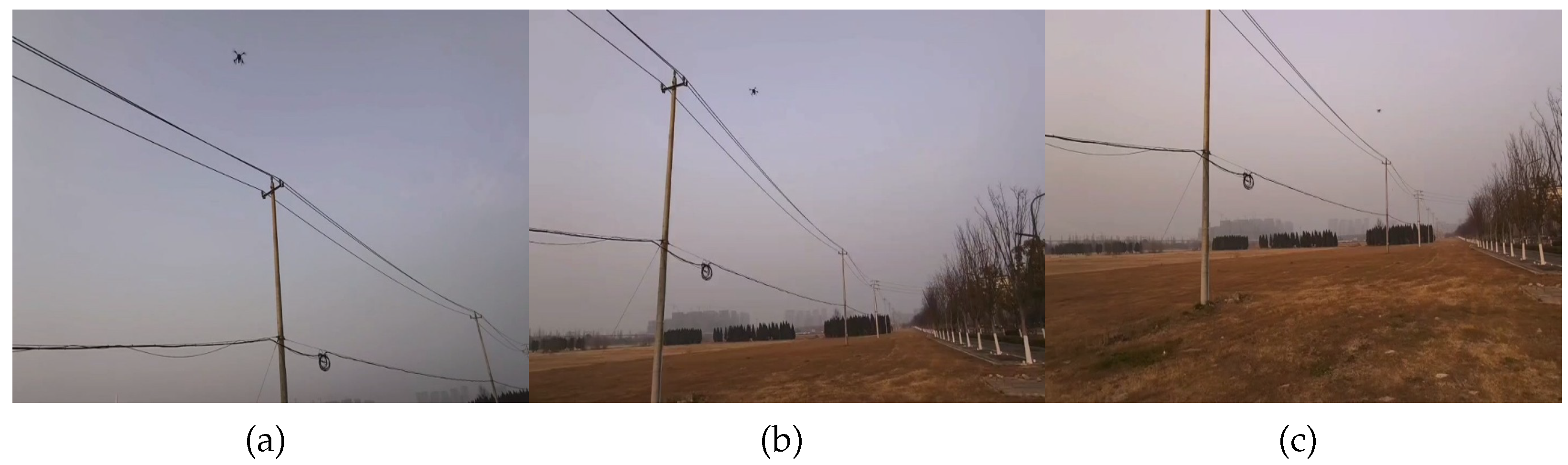Figure 13b,c show the drone flying towards the target tower to be inspected at the next level and conducting defect detection on the tower at the next level.