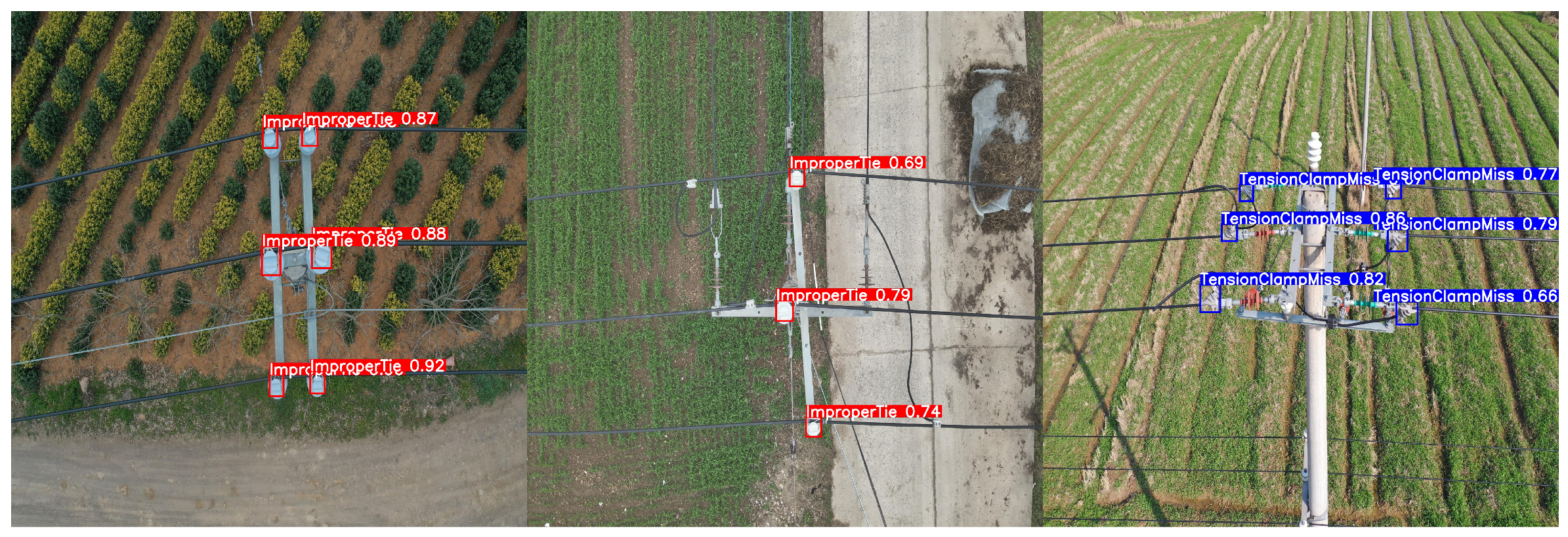 Table 5. Among the annotations, there are 11,472 instances of improperly tied defects and 13,039 instances of missing protective shells, covering a wide range of defect types under various backgrounds and UAV perspectives. This comprehensive dataset ensures the adaptability of the model in real-world power distribution line inspection scenarios.