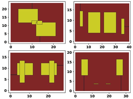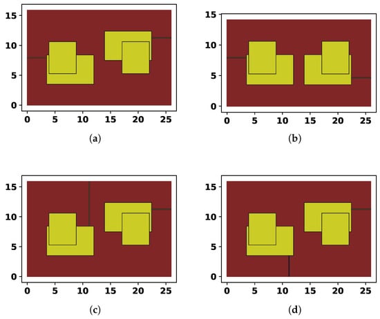 The distance from the edge of the substrate and the main rectangles is always set to mm, regardless of the positioning and mirroring of the resonator. The size of the substrate is adjusted accordingly, as can be seen in Figure 2 by the height difference between cases (a) and (b). The length of the ports is also set to mm where it is possible; for example, in case (c), the second rectangle is above the first one, so the port is longer than it should be. Such cases could be problematic for manufacturing, so they are penalized in the target function.