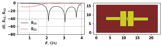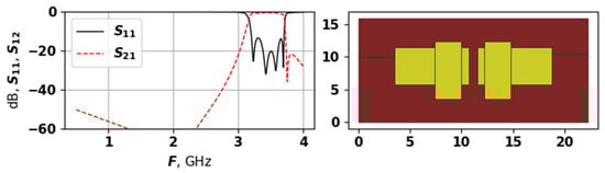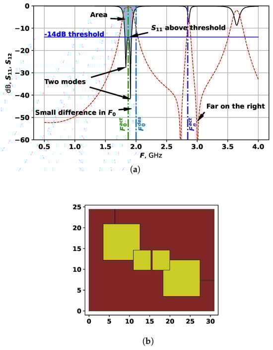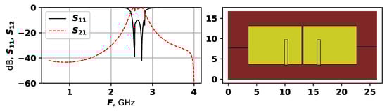 The first target function takes into account the following parameters. The S-parameters of the resonator, evaluated through simulation, are analyzed to find the points where and intersect—these points mark the beginning and the end of the bandwidth (see Figure 1. They will be further referred to as , , i.e., lower actual frequency and upper actual frequency. In contrast, the desired lower and upper frequencies are given as , . The center frequency can be calculated as , same for actual frequencies. The relative bandwidth is therefore calculated as follows: