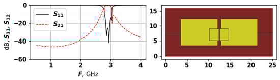 Microstrip resonators represent an important class of devices, which can be used in various applications, including telecommunication technologies [1], radar and navigation systems [2], measuring electrical characteristics of various materials [3,4], as well as non-invasive medical measurements [5,6]. The low cost and manufacturability allow them to be used to create bandpass filters, high- and low-pass filters, as well as diplexers and other devices [7,8]. Due to their small size, several millimeters, such resonators can be easily integrated with systems which require wireless communication, such as unmanned vehicles [9,10]. In some cases, such as radars and antennas, a wide range of frequencies should be covered, while in others, such as sensors, a very narrow bandwidth is required. The frequency-selective properties are tuned by bringing together several lowest oscillation modes while miniaturizing the scales of the construction [11].
