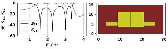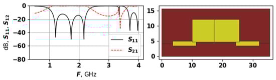 As can be seen from Figure 17, the two target functions used in the experiments are in fact different in their preferences, as they appear to form a structured picture of fronts. There is one solution on the left hand side, which is much better, than many others, as it is very good according to both objectives. This solution has number 57,861 in the joined set, which corresponds to 23,855 in the results of the second experiment—its S-parameters and topology has already been shown in Figure 12. Other members of the first Pareto front, which has 28 solutions, have similar structure to Figure 11, for example, solution with number 41,261, which has already been shown in Figure 14. There are also some trade-off solutions; however, they are also similar to solution 41,261. One of such is shown in Figure 18.