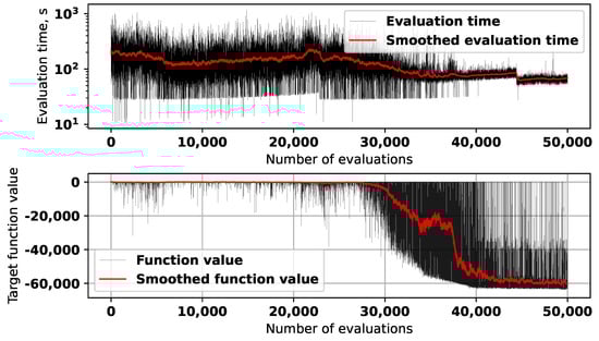 As the upper part of Figure 10 demonstrates, the average evaluation time during the experiment with the second target function stayed around 100 s. As for the convergence graph, for the first 25,000 evaluations, the algorithm was in the exploration phase, discovering some promising solutions occasionally. After this, one of the promising regions was identified, and the fast convergence process was started. By the moment when 40,000 were reached, the algorithm basically converged to the best solution with number 41,261, which is shown in Figure 11.