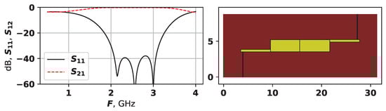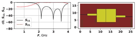 The solution shown in Figure 11 has a very wide bandwidth, and also the peaks of reflection losses between modes are at the level of dB. The topology is very symmetric and regular, and also quite compact. The best solution has only 3 modes, but they are placed at an ideal distance from each other, that is, the value of the third function equals zero. However, the slopes of the are very long and smooth, which may be not a good thing for certain applications—for example, where a narrow bandwidth is required. Nevertheless, this solution actually achieves all three goals, which were included in the target function.