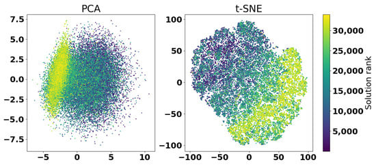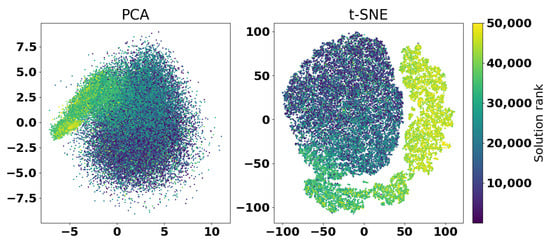 The solutions in Figure 15 are ranked and colored according to their target function values. The ranks are used instead of fitness values directly to add contrast to the figure. As can be seen on the left side, the PCA shows that in the beginning the solutions are evenly distributed, but closer to the end, the best solutions are concentrated in a elliptic-shaped area. On the other hand, the t-SNE shows that there is a significant diversity among the best solutions—points with similar color are located far away from each other. This means that even 30,000 evaluations the L-SRTDE has a significant diversity in the population, which would allow continuing the optimization.