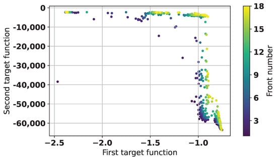 To analyze the differences between two used objective functions and their effects on the found solutions properties, all of the obtained structures (34,006 + 50,000 totally) were additionally cross-evaluated by both objectives. Figure 17 shows the results of the non-dominated sorting of all solutions, in particular, only the best 1000 solutions are shown. There are 18 fronts in Figure 17, but the total number of fronts is 16,595.