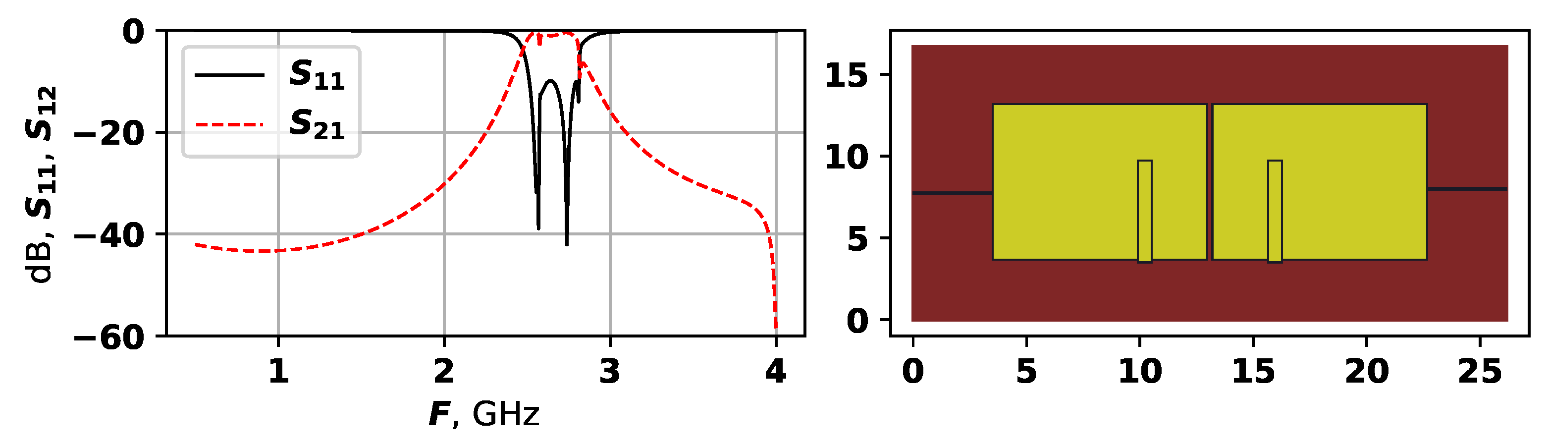 - Dovbysh, I.; Tyurnev, V. Synthesis and Investigation of Three-Section Microstrip Filter on Folded Dual-Mode Stepped-Impedance Resonators. Prog. Electromagn. Res. 2010, 12, 17–28. [Google Scholar] [CrossRef]