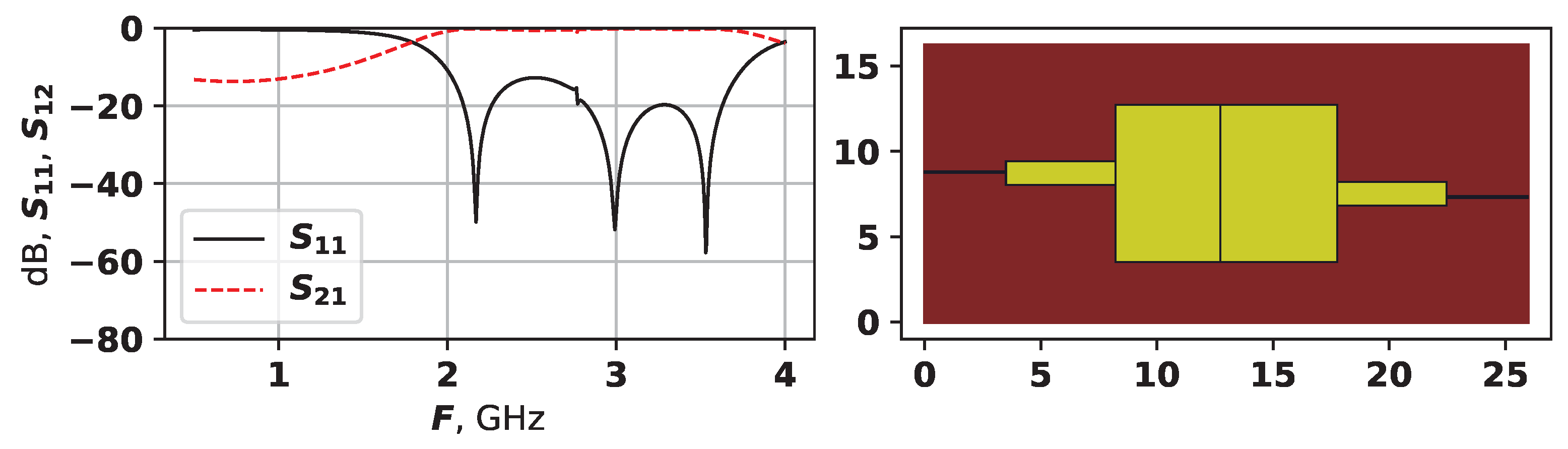 - Chen, C.F.; Lin, C.; Weng, J.H.; Tsai, K.L. Compact microstrip broadband filter using multimode stub-loaded resonator. Electron. Lett. 2013, 49, 545–546. [Google Scholar] [CrossRef]