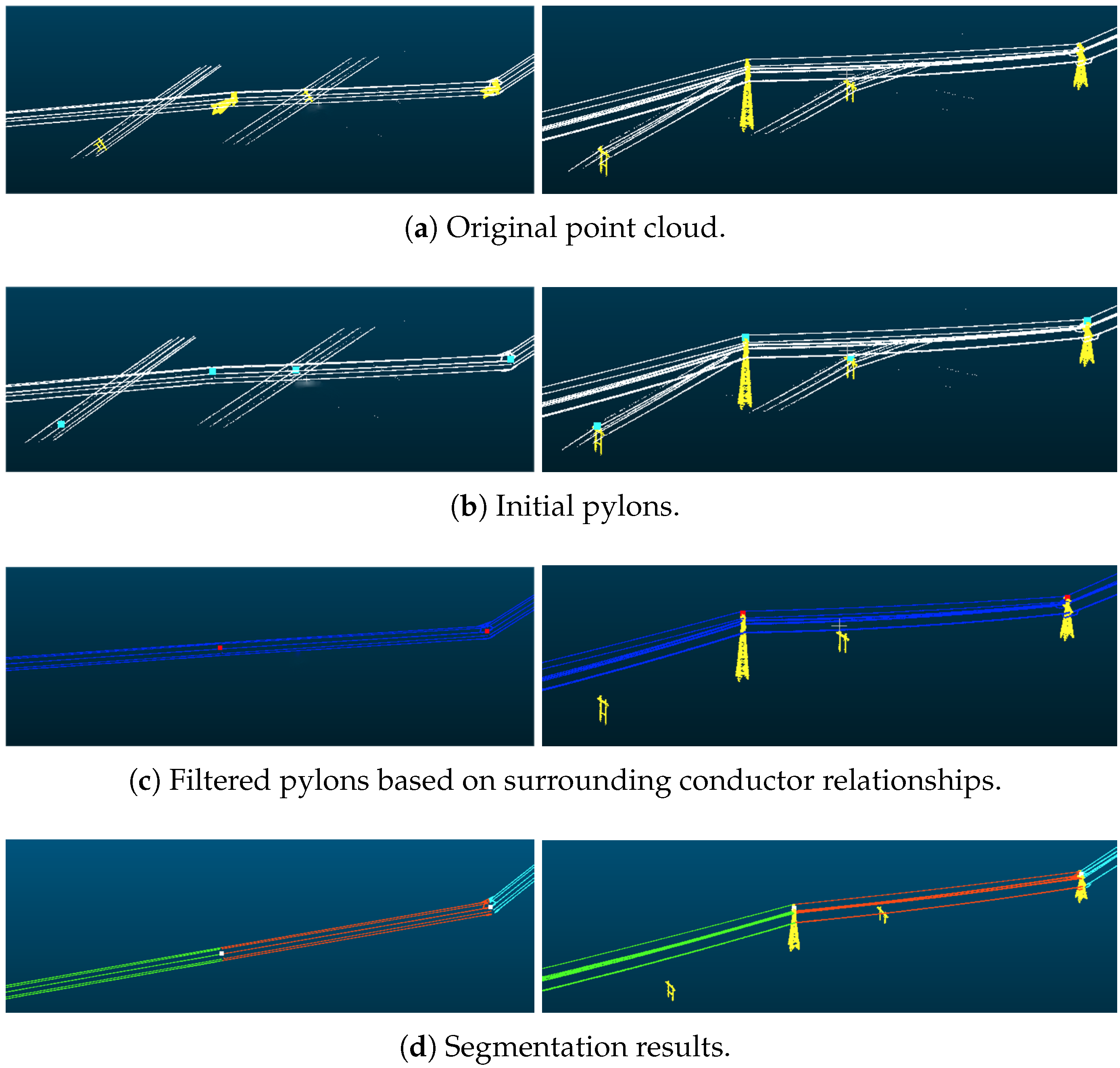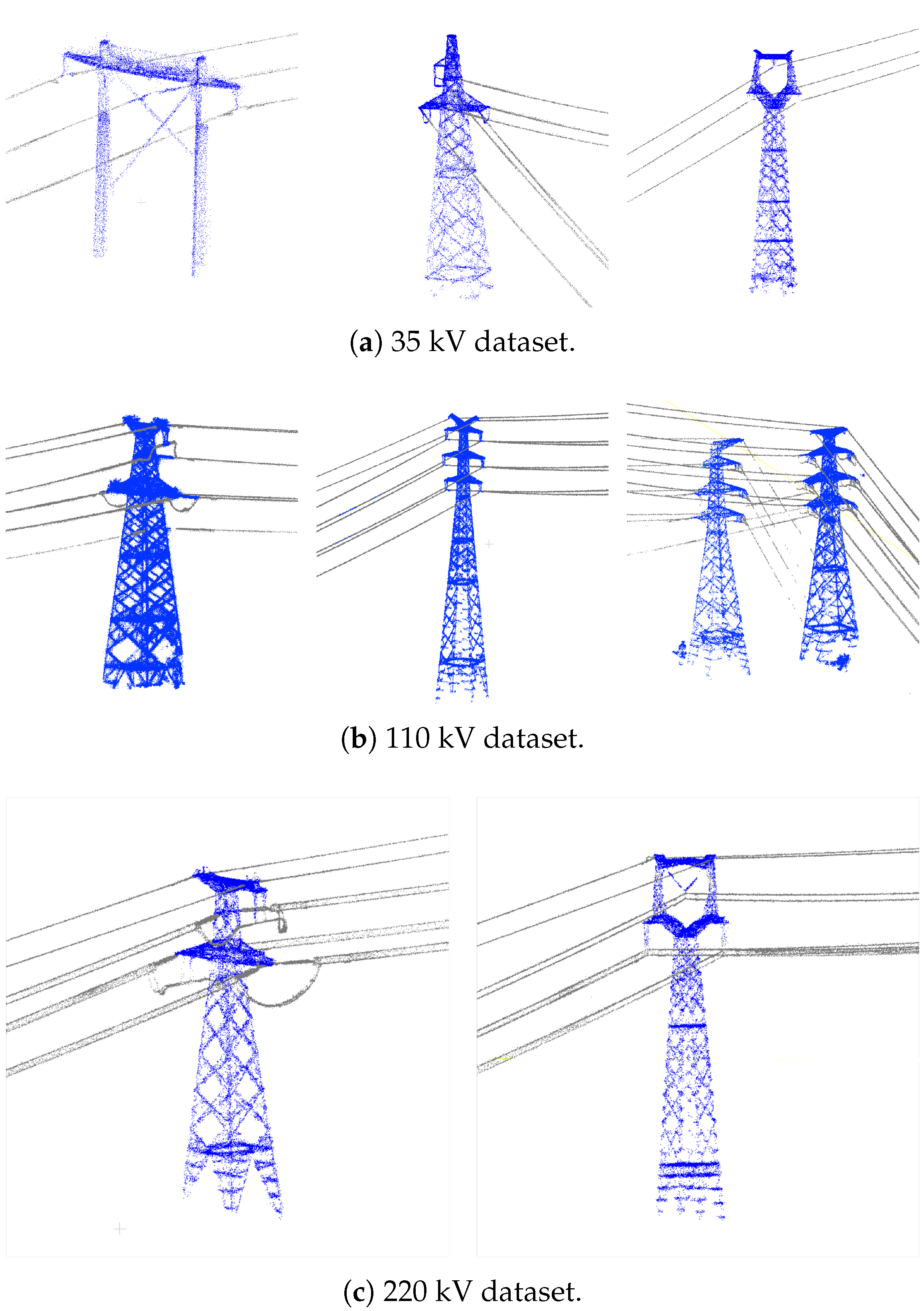 - Cao, D.; Wang, C.; Liu, H.; Zhang, S.; Du, M.; Wang, P.; Nie, S.; Cheng, S. An Automatic Method for Powerline Extraction from ALS Point Cloud of Powerline Corridors. IEEE J. Sel. Top. Appl. Earth Obs. 2025, 18, 10803–10829. [Google Scholar] [CrossRef]
