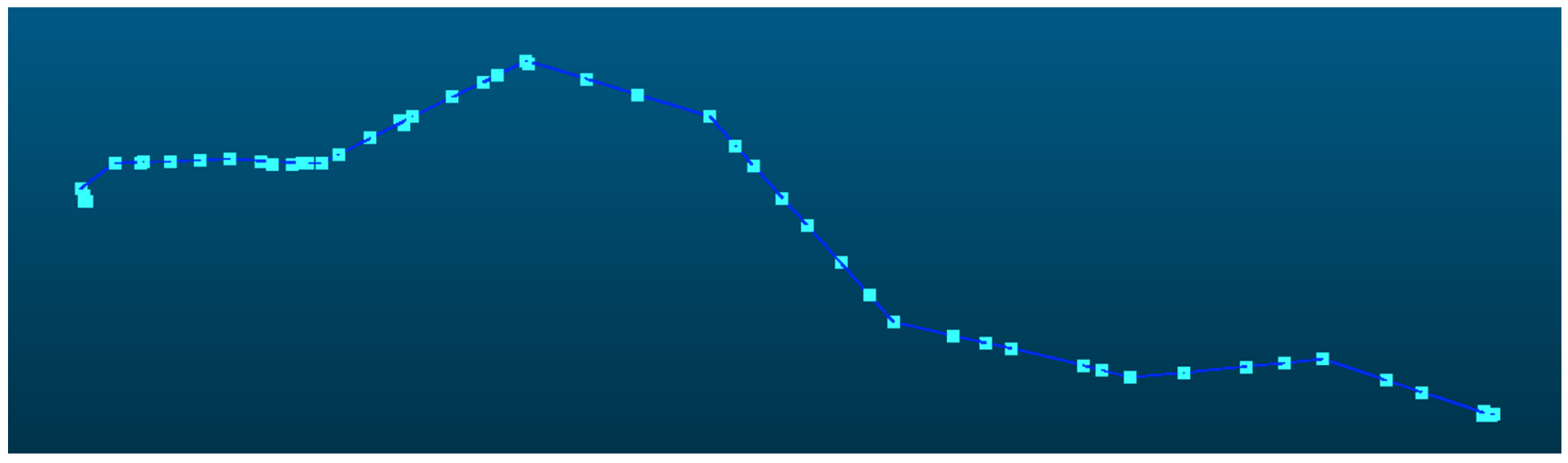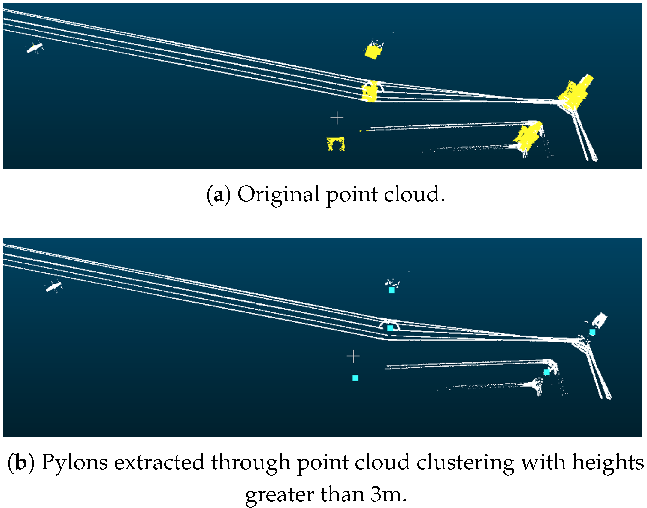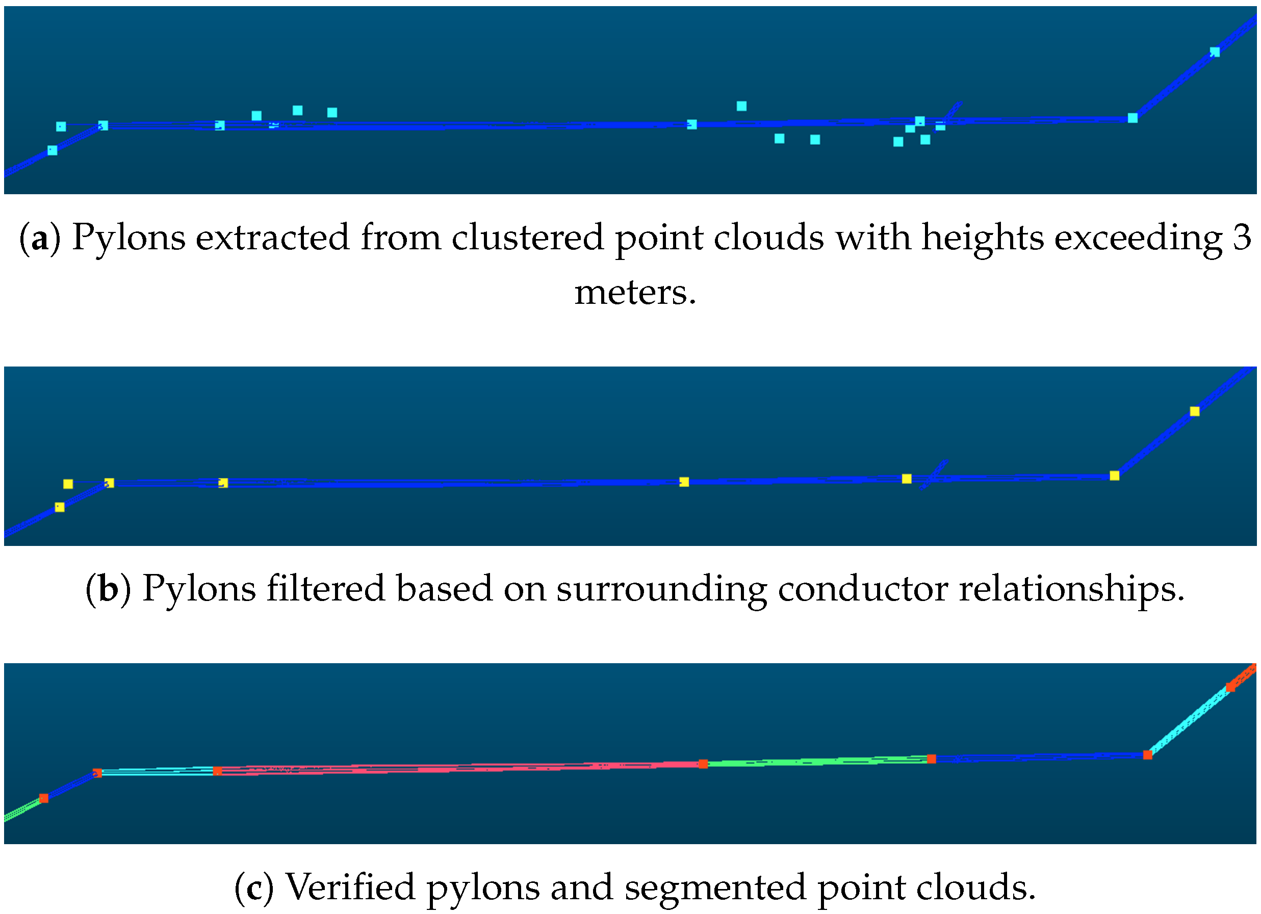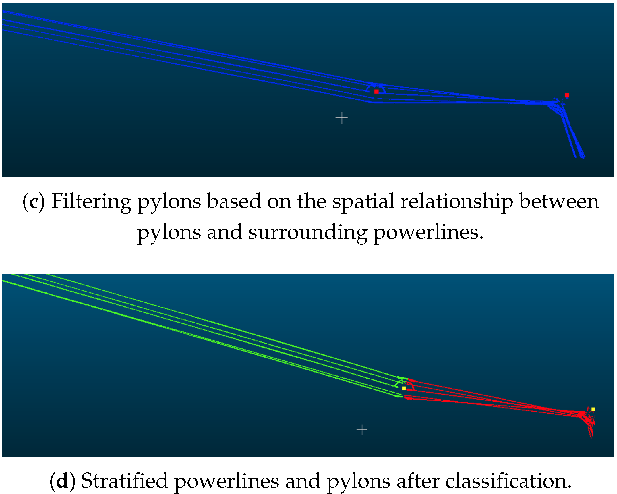 - If the distance from the sampled point to the nearest grid centroid is less than , and the powerline point cloud at this position is not higher than the connecting line of adjacent pylons, mark this sampled point as valid;