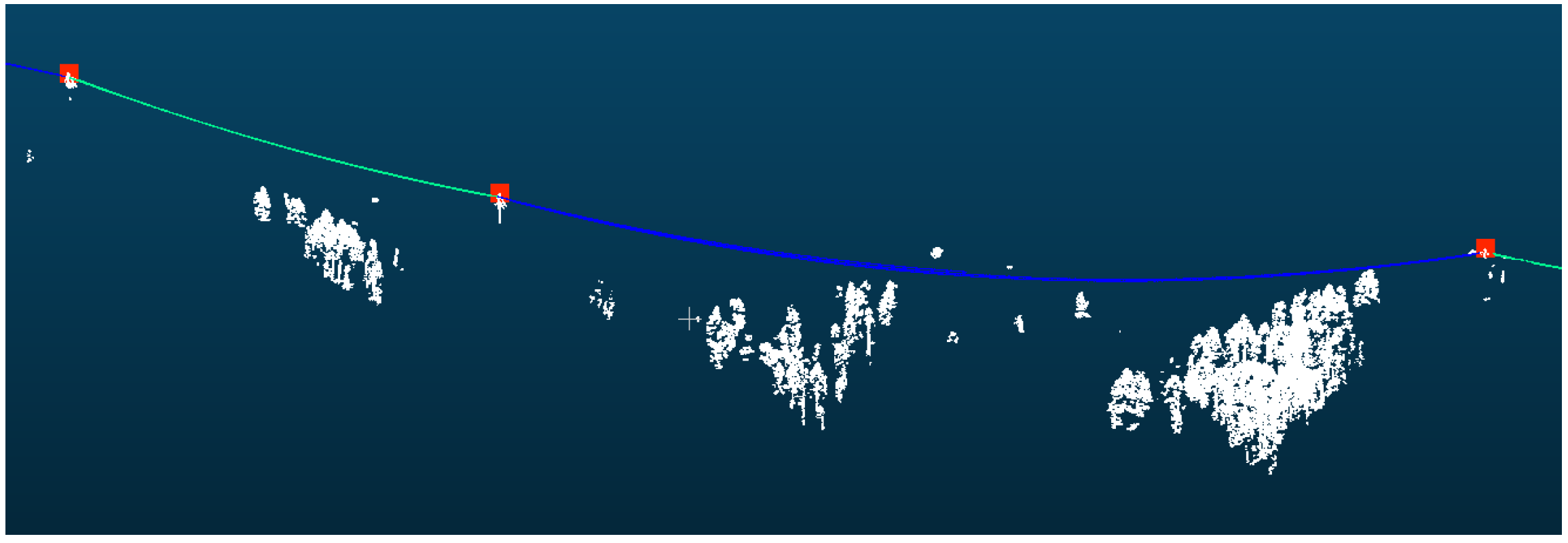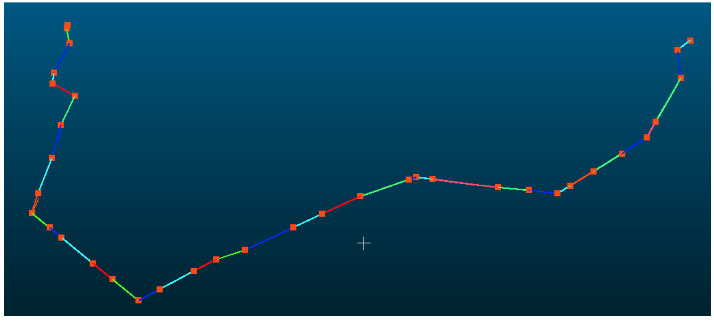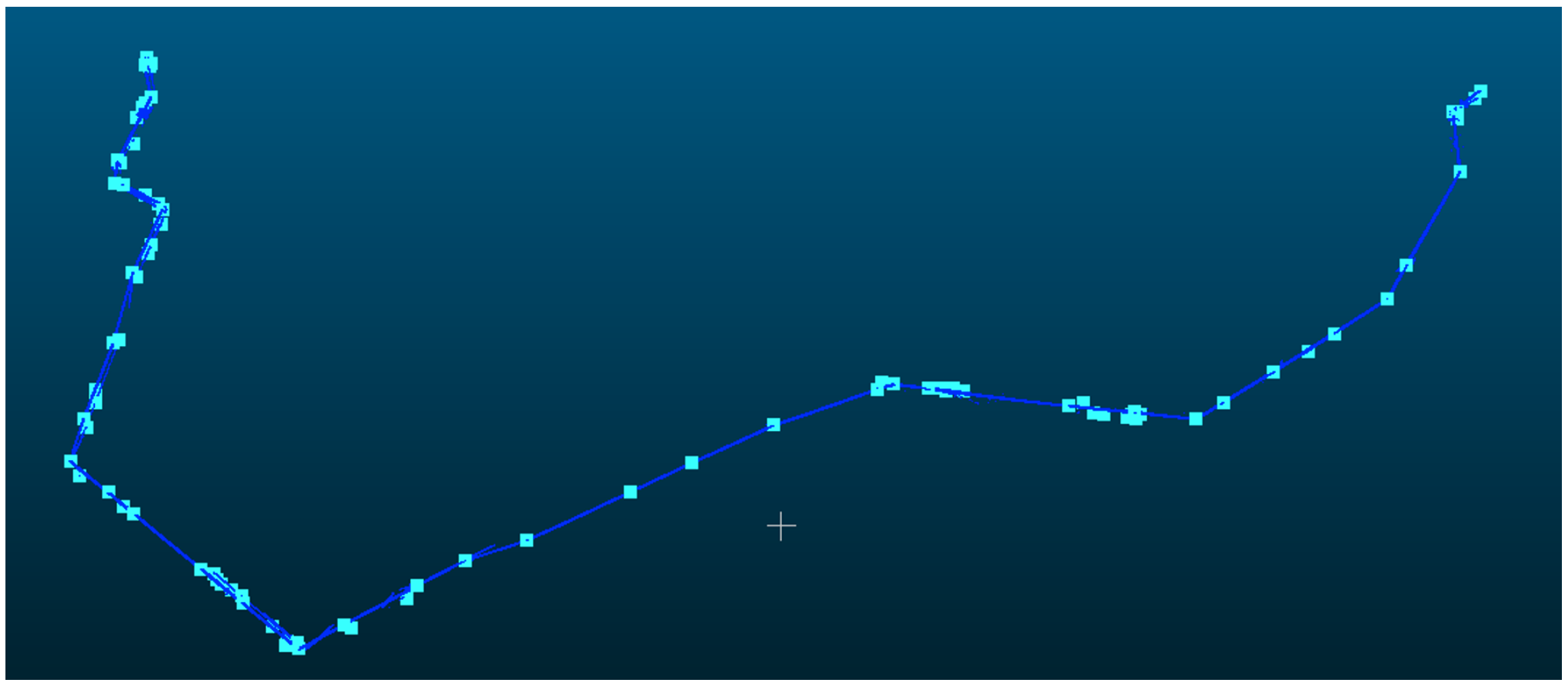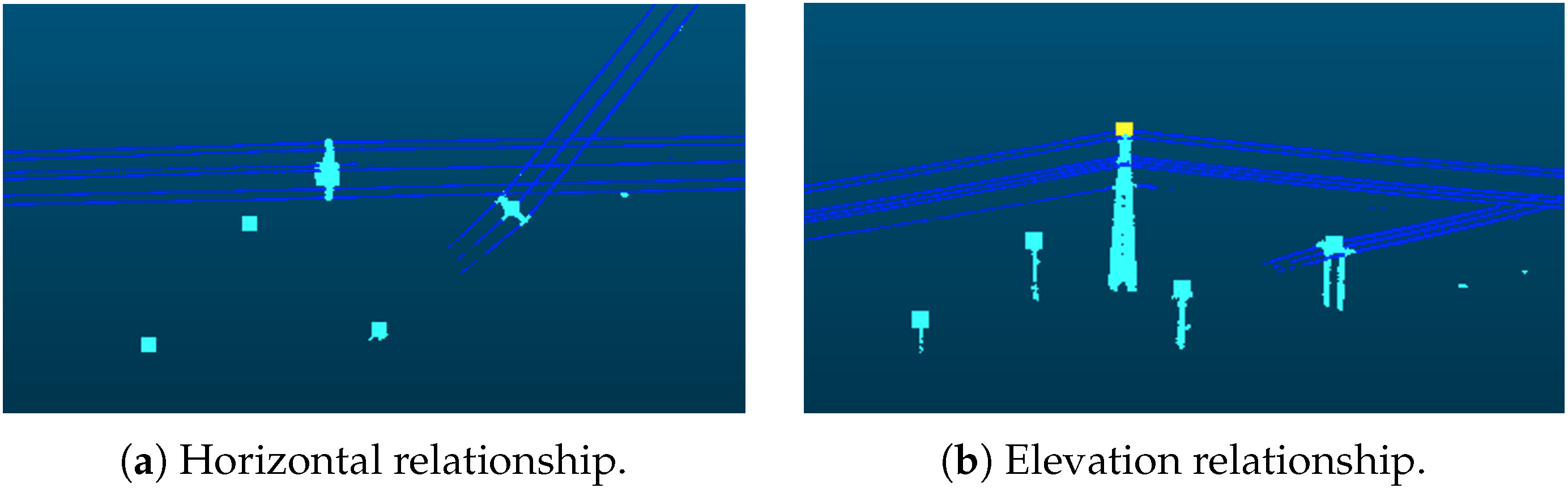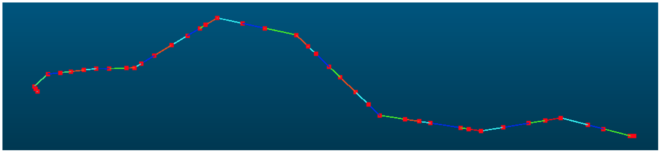 - If the distance from the sampled point to the nearest grid centroid is less than , and the powerline point cloud at this position is not higher than the connecting line of adjacent pylons, mark this sampled point as valid;