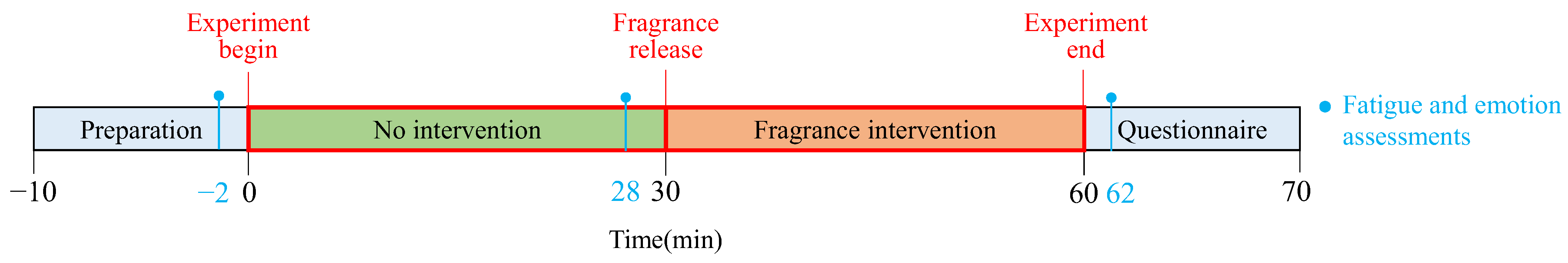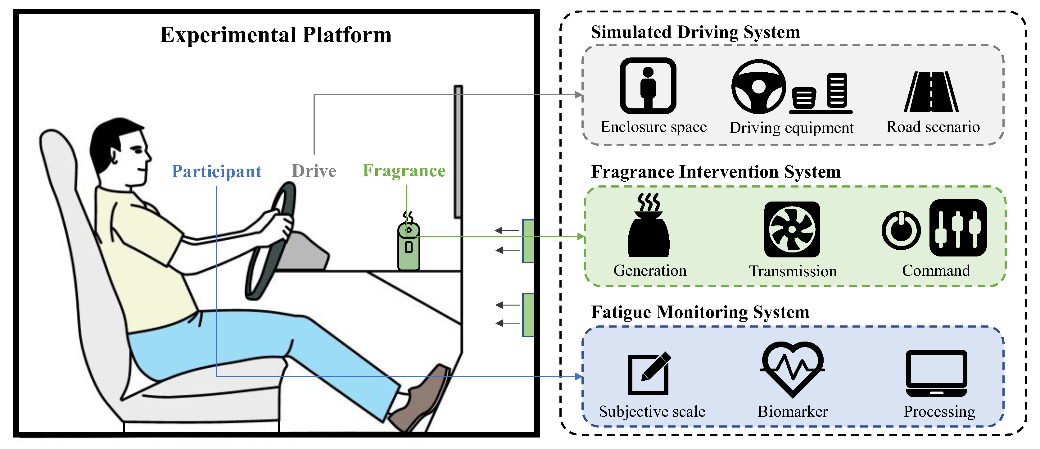 14]. However, research on the application of fragrances in driving fatigue intervention remains relatively limited. Specifically, there is a lack of systematic exploration of how factors such as fragrance type, intervention intensity, and release mode affect the psychophysiological states of drivers.