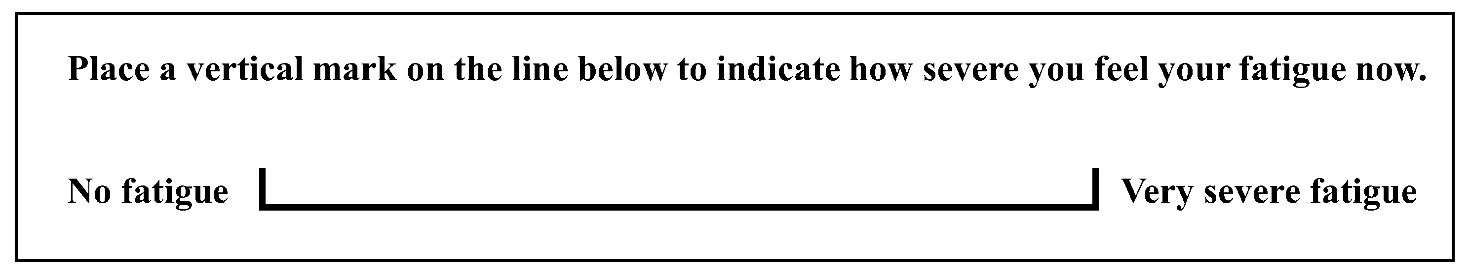 Figure 4). Participants were asked to mark a point on the line that they felt best represented their current state. The possible score range is from 0 to 1, and the score is measured in millimeters from the “no fatigue” end to the point indicated by the participant, using a ruler. The score is calculated by measuring the length of the line segment from the “no fatigue” point to the point indicated by the participant, divided by 100 mm. Higher VAFS scores indicate higher levels of fatigue.