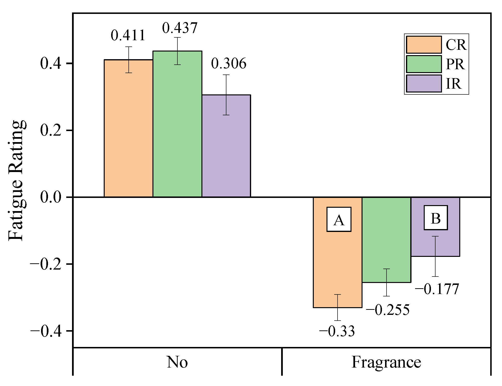 35]. However, significant differences were observed in the interaction between release mode and intervention intensity. The continuous release mode (CR) had a notably superior effect on subjective fatigue ratings compared to the intermittent release mode (IR). The continuous release mode provides a continuous fragrance stimulus to the driver, which may help alleviate fatigue during driving, whereas the intermittent release mode, due to its discontinuous fragrance delivery, may fail to maintain the same fatigue-relief effect. The fatigue ratings for the pulse release mode (PR) were intermediate between the continuous and intermittent modes, showing some alleviating effect but with no significant difference from the other two modes. This finding suggests that continuous fragrance release is more effective in regulating subjective fatigue, whereas intermittent release may be less effective due to the discontinuous nature of the stimuli.