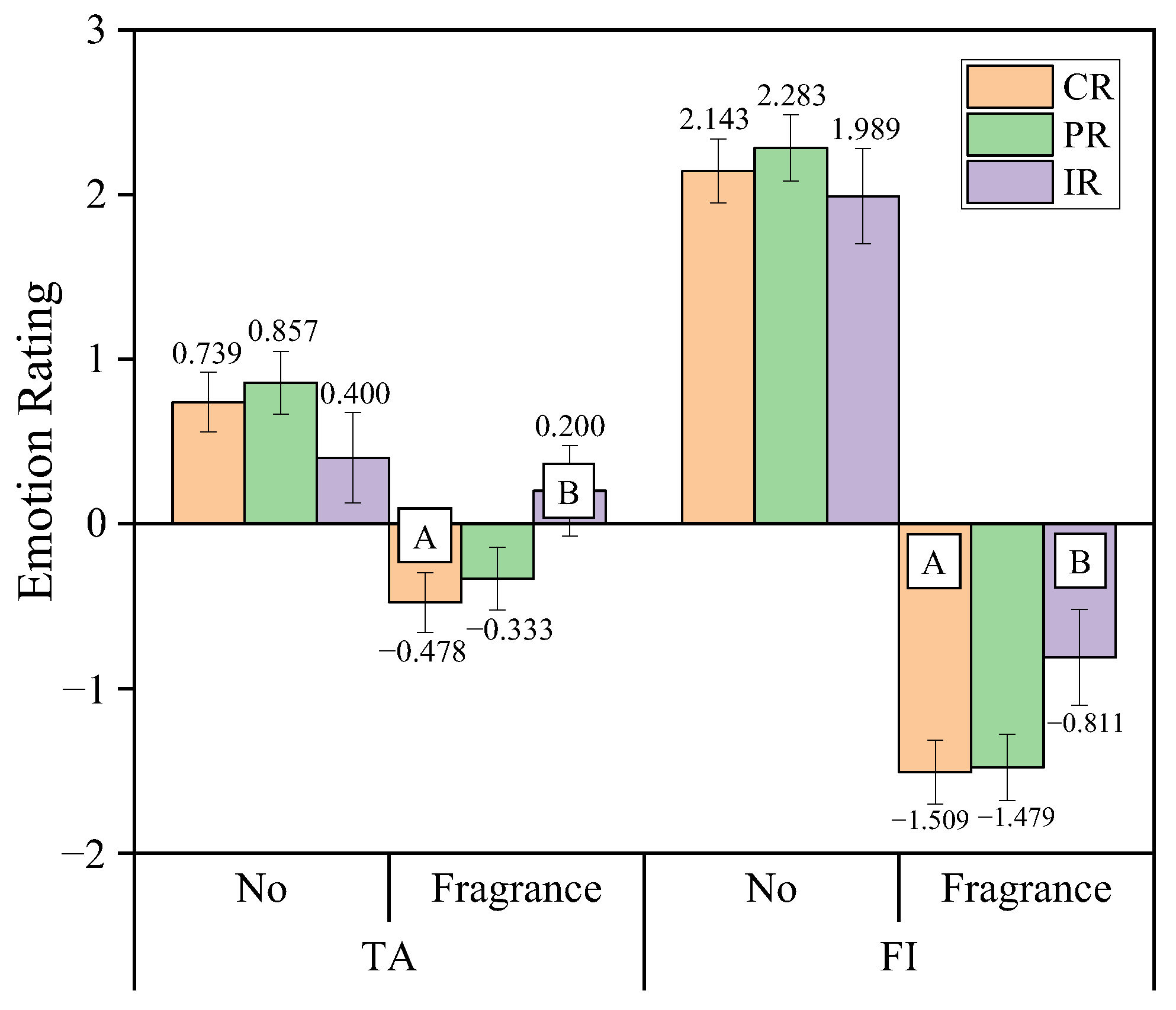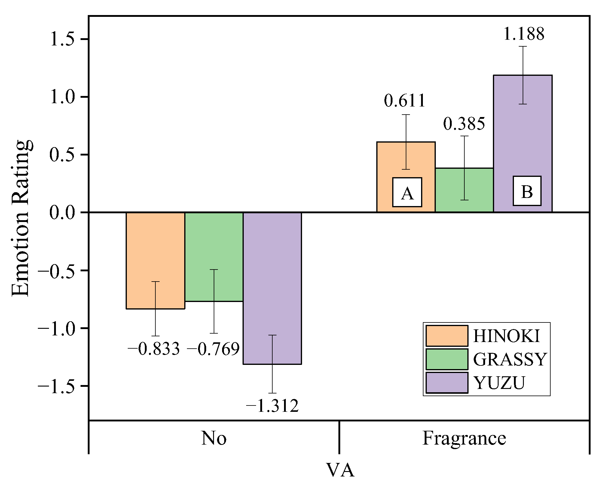 Figure 7). This result may be related to the specific olfactory characteristics of the fragrances, as different scents may evoke different physiological and emotional responses, particularly in terms of enhancing vitality, with some fragrances being more effective. Similar studies have shown that citrus fragrances, due to their fresh and invigorating properties, can significantly improve mood vitality and alleviate negative emotional stress [