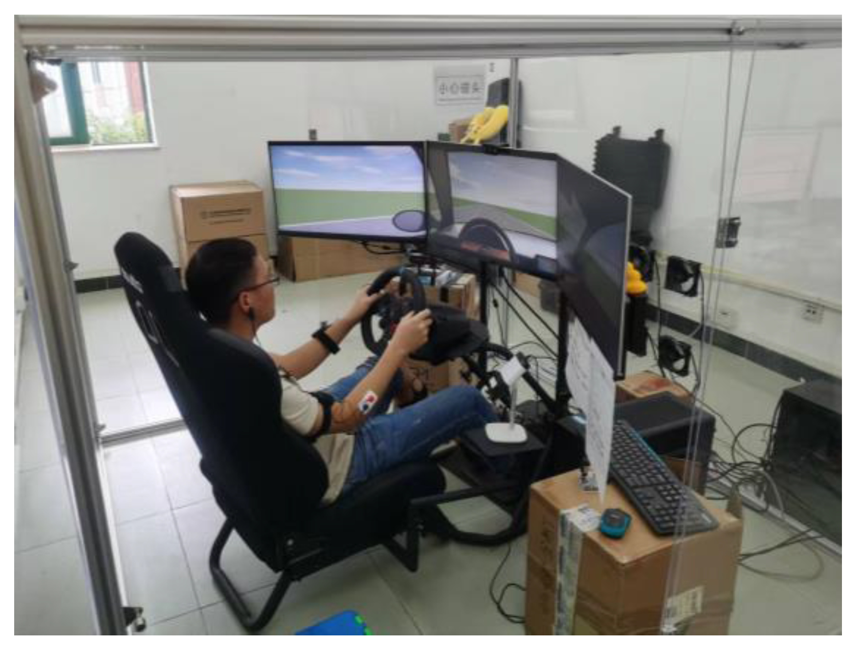 Figure 3. After the experiment began, participants performed the driving tasks in a closed driving simulator, using monotonous driving scenes to induce driver fatigue. The driving scenario consisted of a highway with a constant speed of 120 km/h and no other traffic, thus avoiding interference such as collisions.