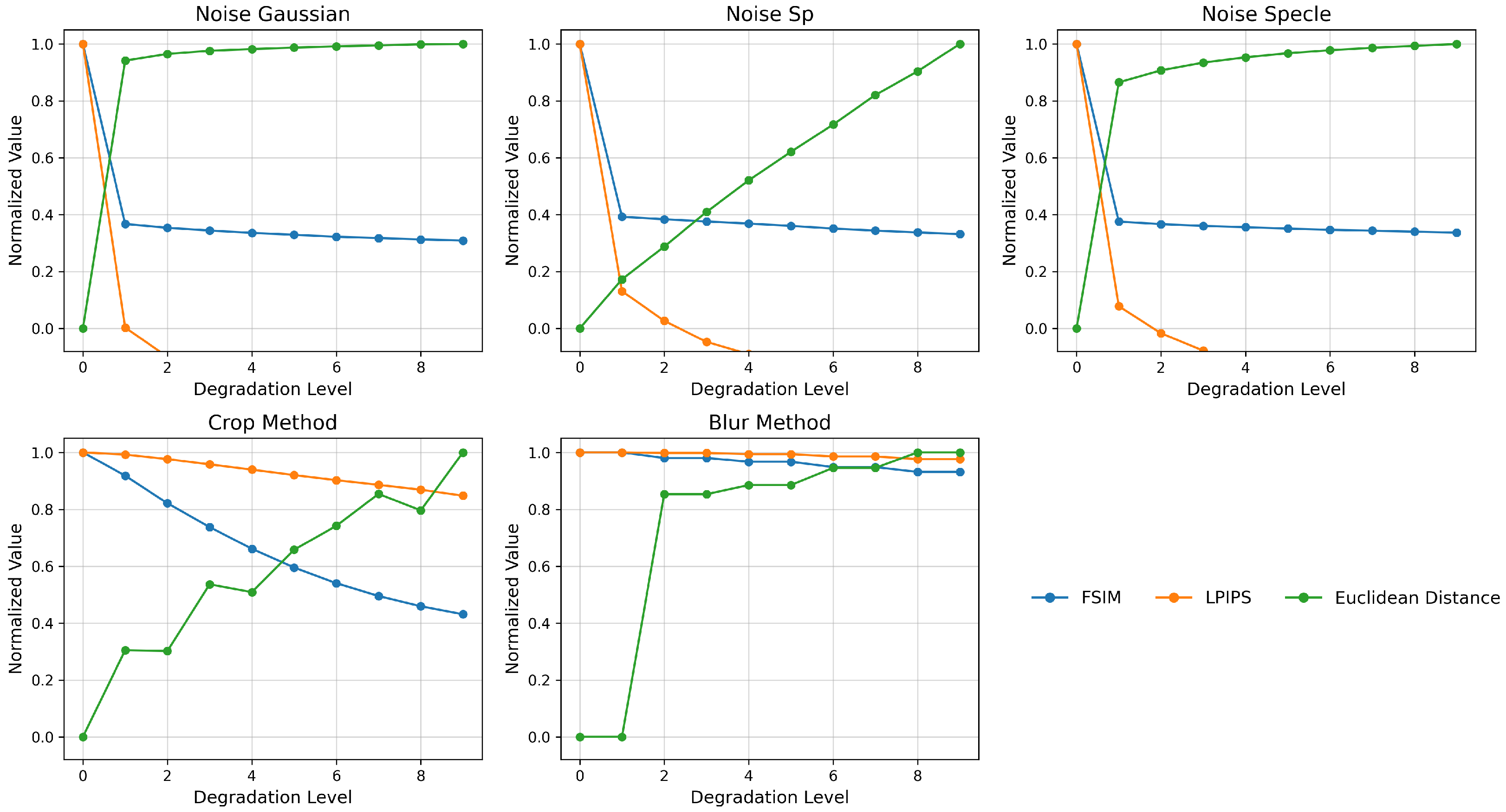 A systematic evaluation of the stability and sensitivity of selected image quality metrics was conducted for three types of degradation: shift (crop-shift), Gaussian blur, and various noise models (Gaussian, speckle, salt-and-pepper). For each transformation, the behavior of ten metrics was analyzed, including classic pixel-based measures (MSE/PSNR [