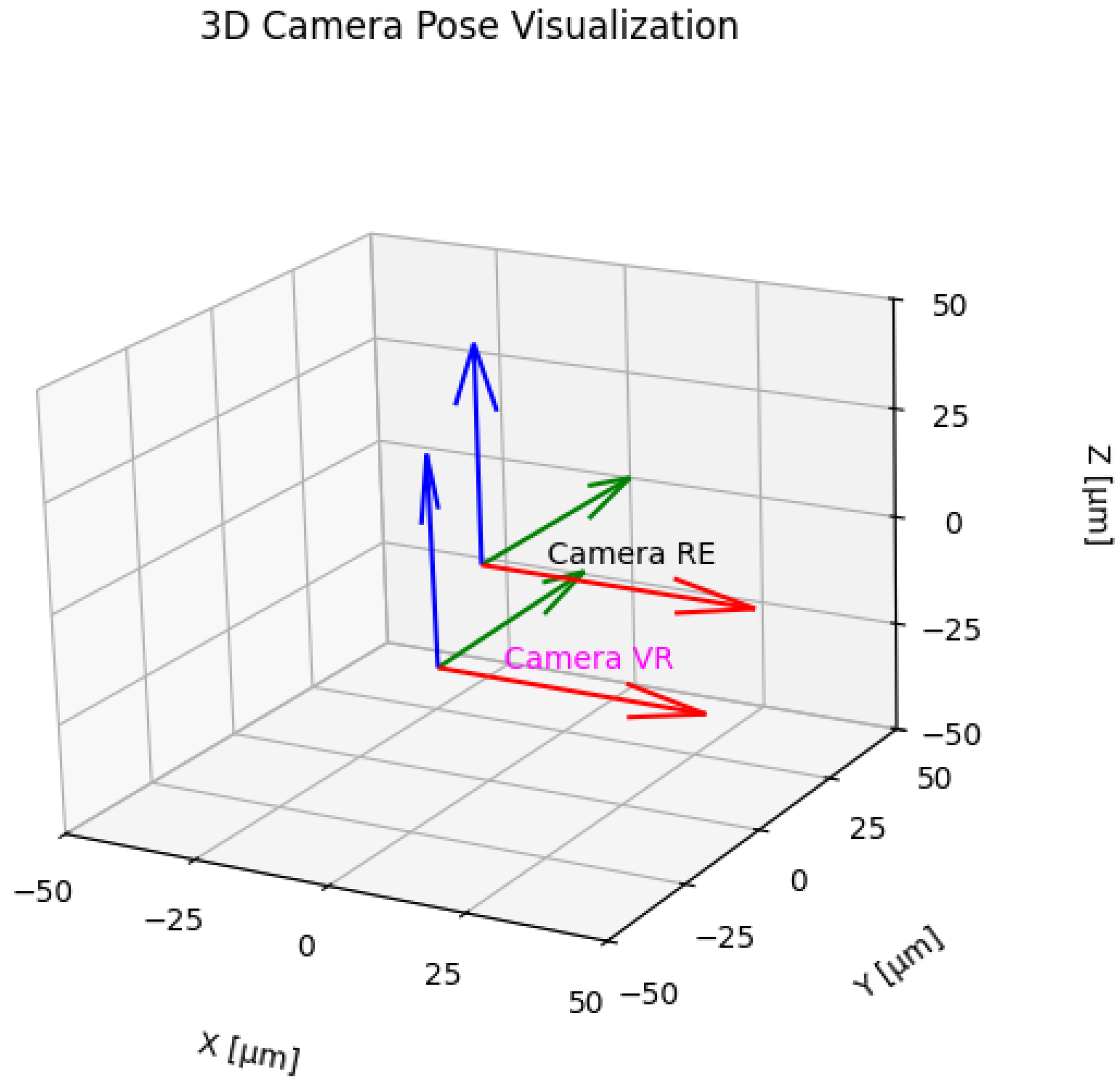 Geometric Fidelity: Imaging systems can be described using an equivalent optical system, which is a camera model, the operation of which is described by the implementation of the central projection). The parameters of this equivalent camera (e.g., focal length, position, orientation) can be derived from the images it produces. By comparing these parameters between the real system and the digital twin, we can quantify their geometric differences.