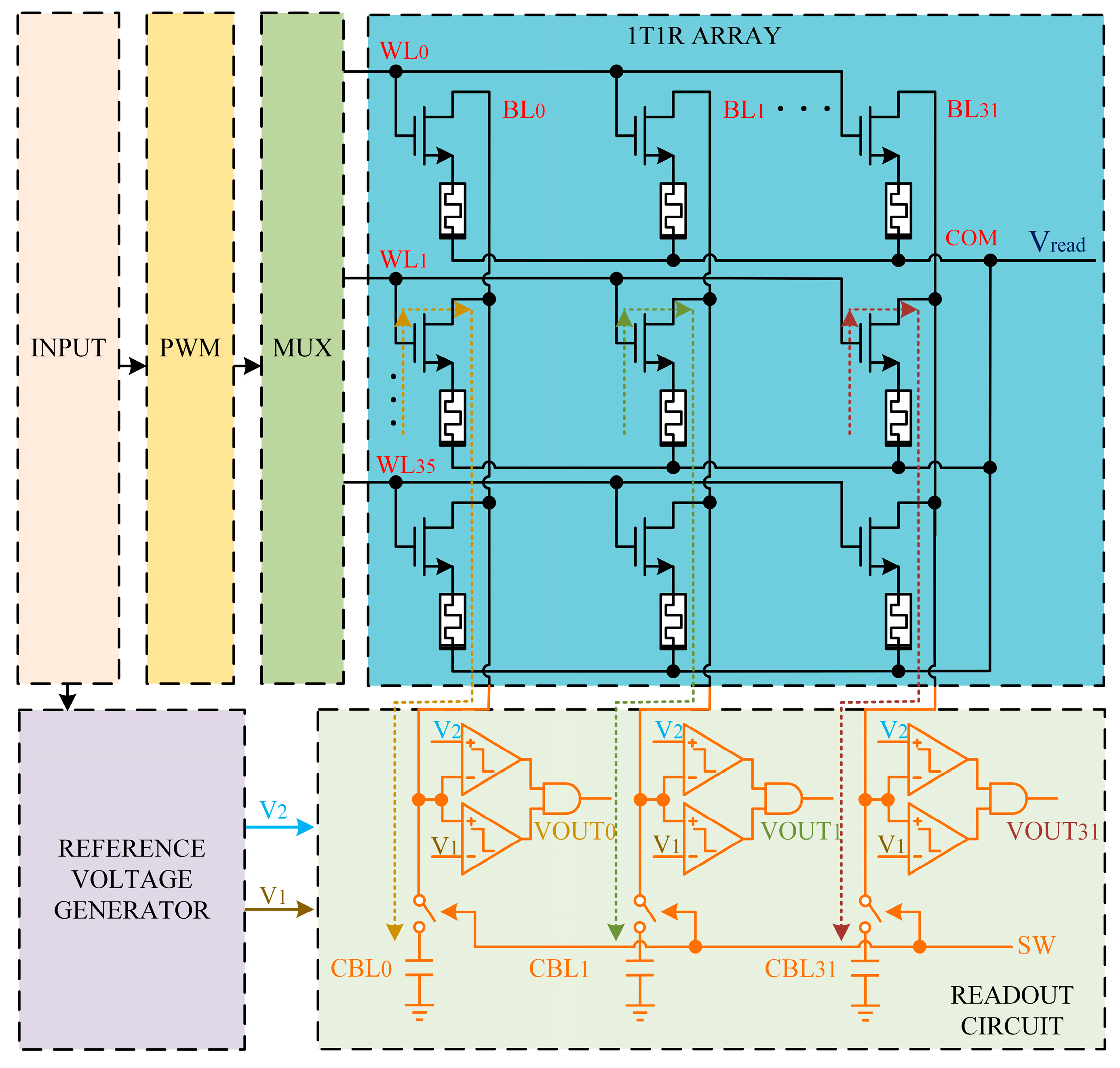 - The 1T1R array adopts a common-top-electrode structure composed of 1T1R unit cells. The word lines are set high for row selection by enabling the transistors, while the bit lines are used to access the memristors in a given column and are connected to the readout circuit;