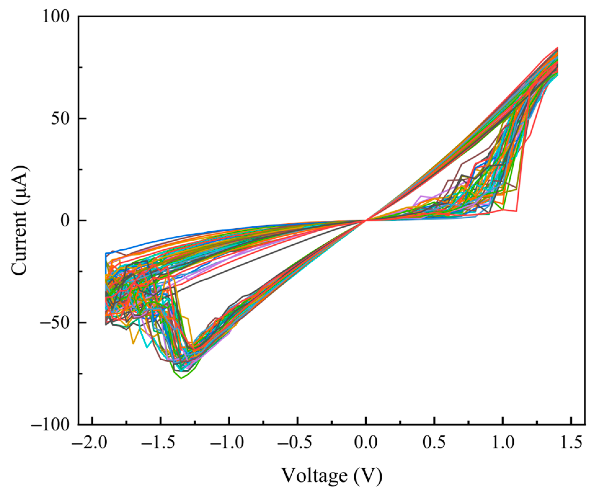 - Limits on Stable States: The number of distinguishable states in memristors is not unbounded, as it is constrained by several critical factors. First, the memristor′s resistance window ratio (the ratio between its high- and low-resistance states) directly determines the upper limit of achievable stable states. A larger window ratio theoretically enables more intermediate states to be distinguished. Second, due to device-to-device variations within an array, the specific resistance value of a target state is subject to fluctuations. Furthermore, the performance of peripheral circuits, such as the magnitude of the read voltage and the precision of the read/write circuit (including comparator resolution and reference voltage stability), collectively forms the ultimate bottleneck limiting the number of distinguishable states.