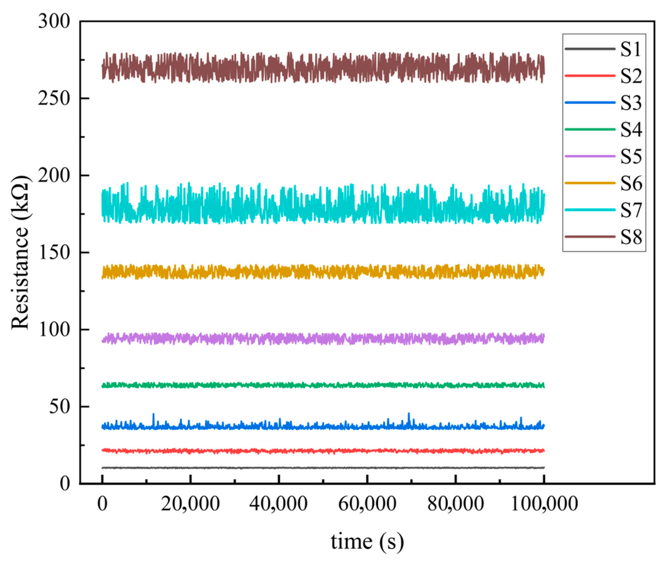 - Device Yield: In our previous study [17], the fundamental yield of devices was measured to be 99.5% (Figure 9 of the reference). In the current work, we conducted eight-state programming tests on 50 randomly selected devices, with results showing no overlap in the resistance distributions across all states for any device. Considering these findings collectively, although exhaustive testing of all devices was not performed, we can reasonably infer that the yield of devices capable of being reliably programmed into eight non-overlapping states is no less than 99%.