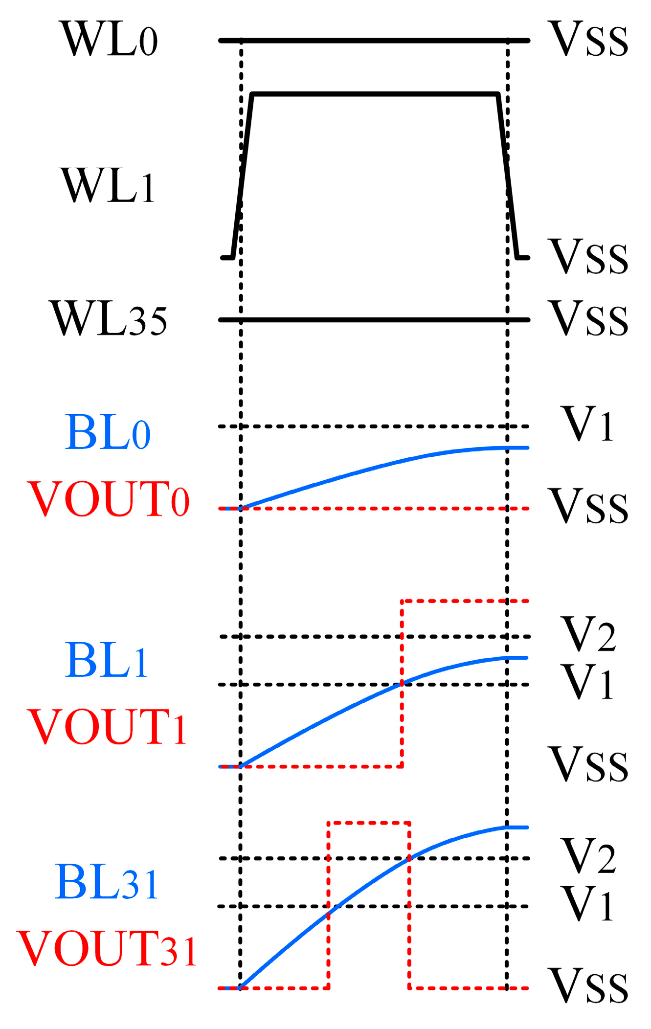 - Using capacitors and voltage comparators, the readout circuit compares the bit-line voltage to reference voltages and yield the result.