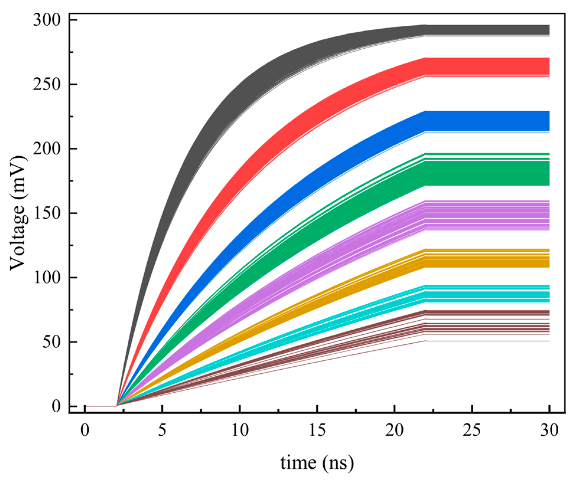 - Latency: Based on the circuit architecture presented, the primary sources of delay reside in the RC charging phase and comparator response. With reference to the approximately 20 ns charging delay shown in Figure 13 and the typical 40 ns delay specified in the comparator datasheet, we estimate the system′s single-operation latency to be within 100 ns;