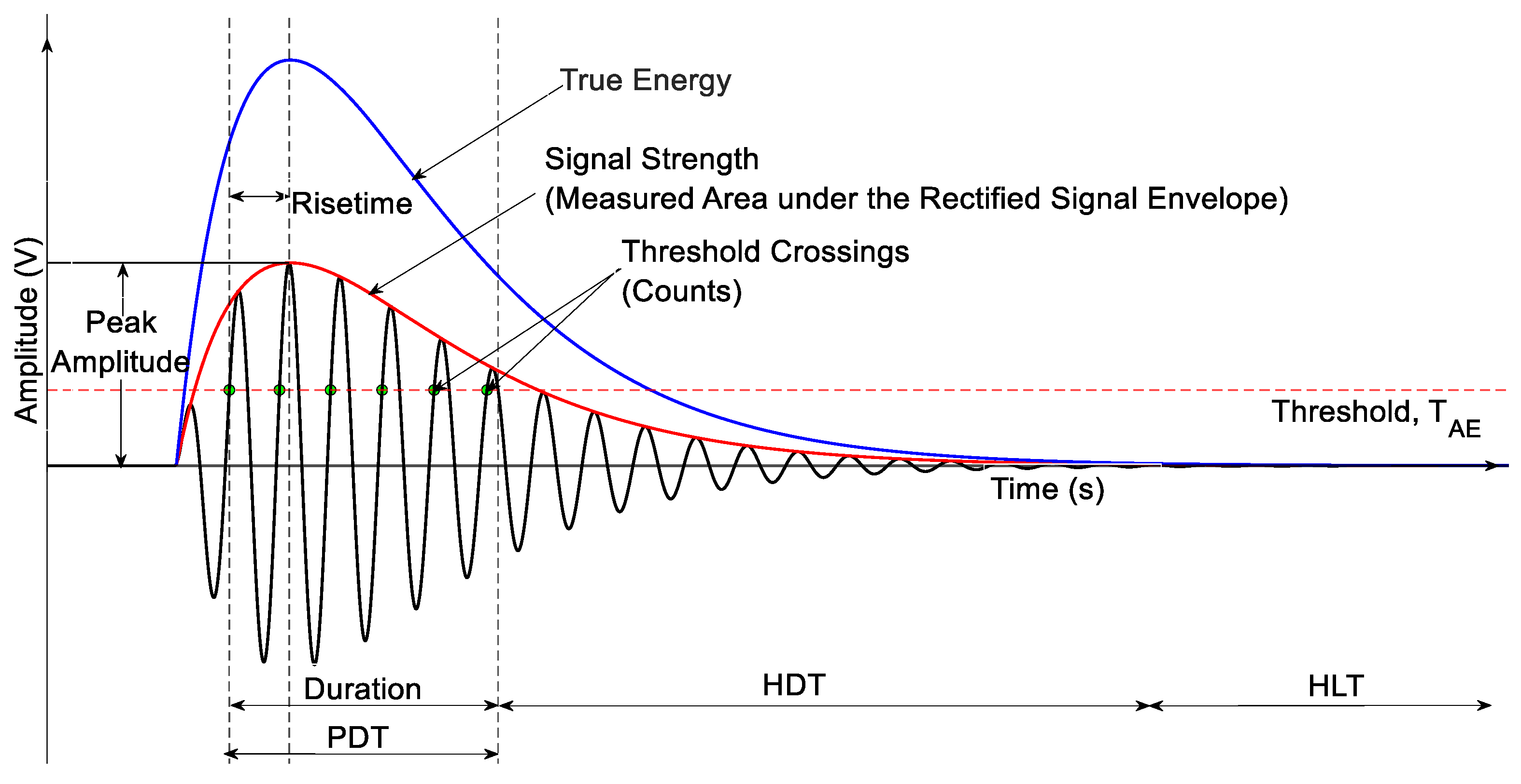 - Counts: Refer to the number of times the AE signal crosses the set threshold level during a single AE hit.