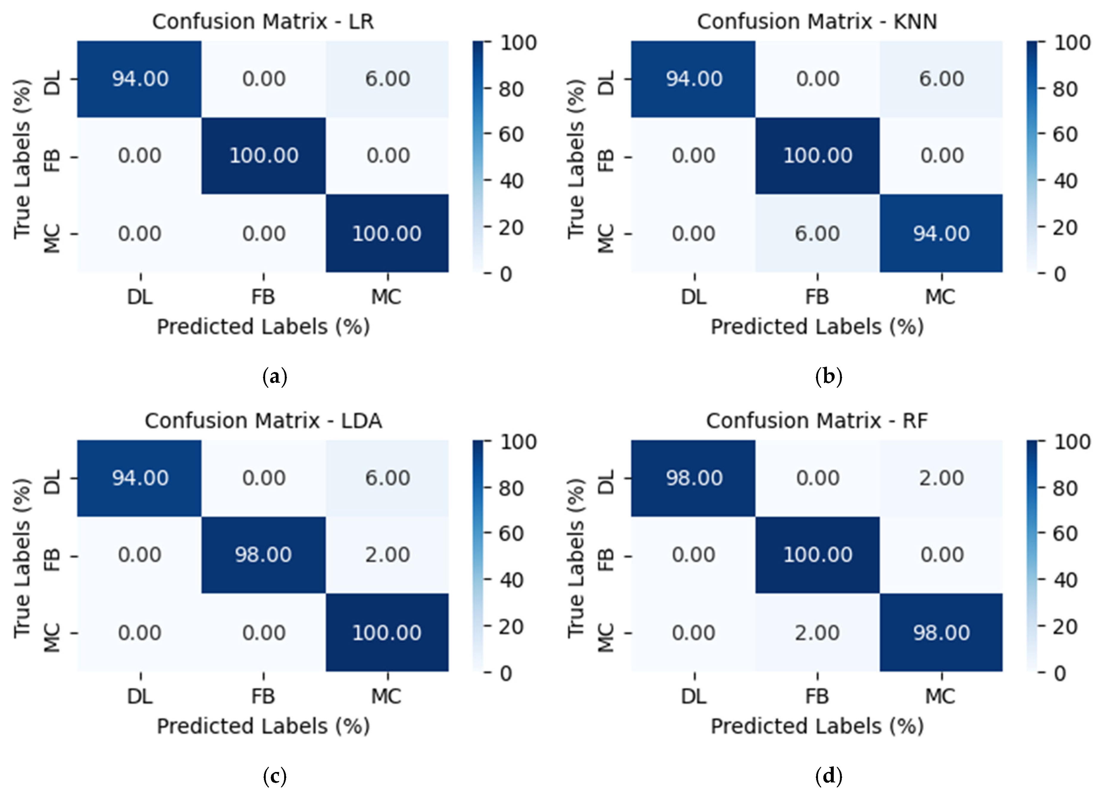 LDA | 97% | DL: 100% FB: 100% MC: 93% | DL: 94% FB: 98% MC: 100% | DL: 97% FB: 99% MC: 96% |