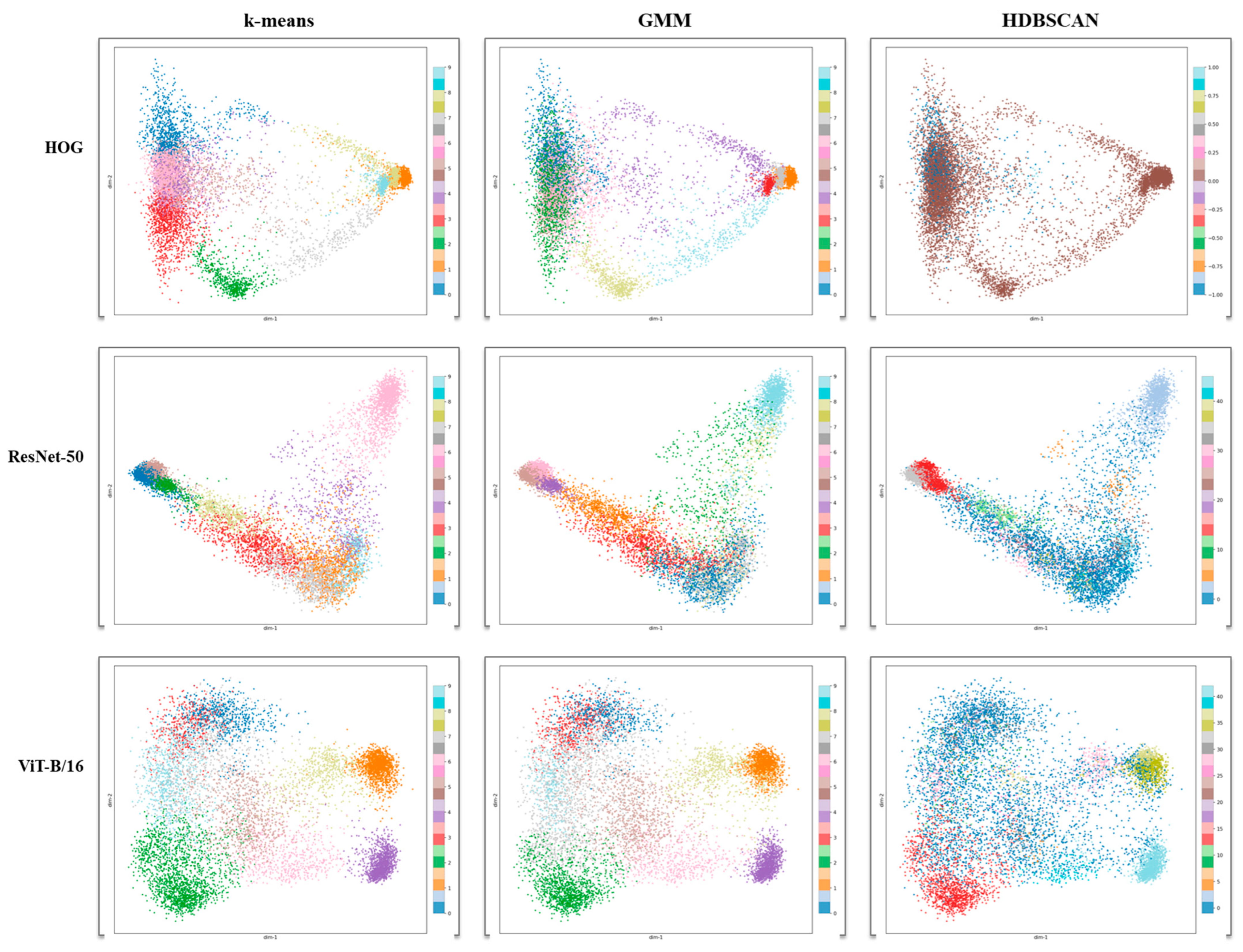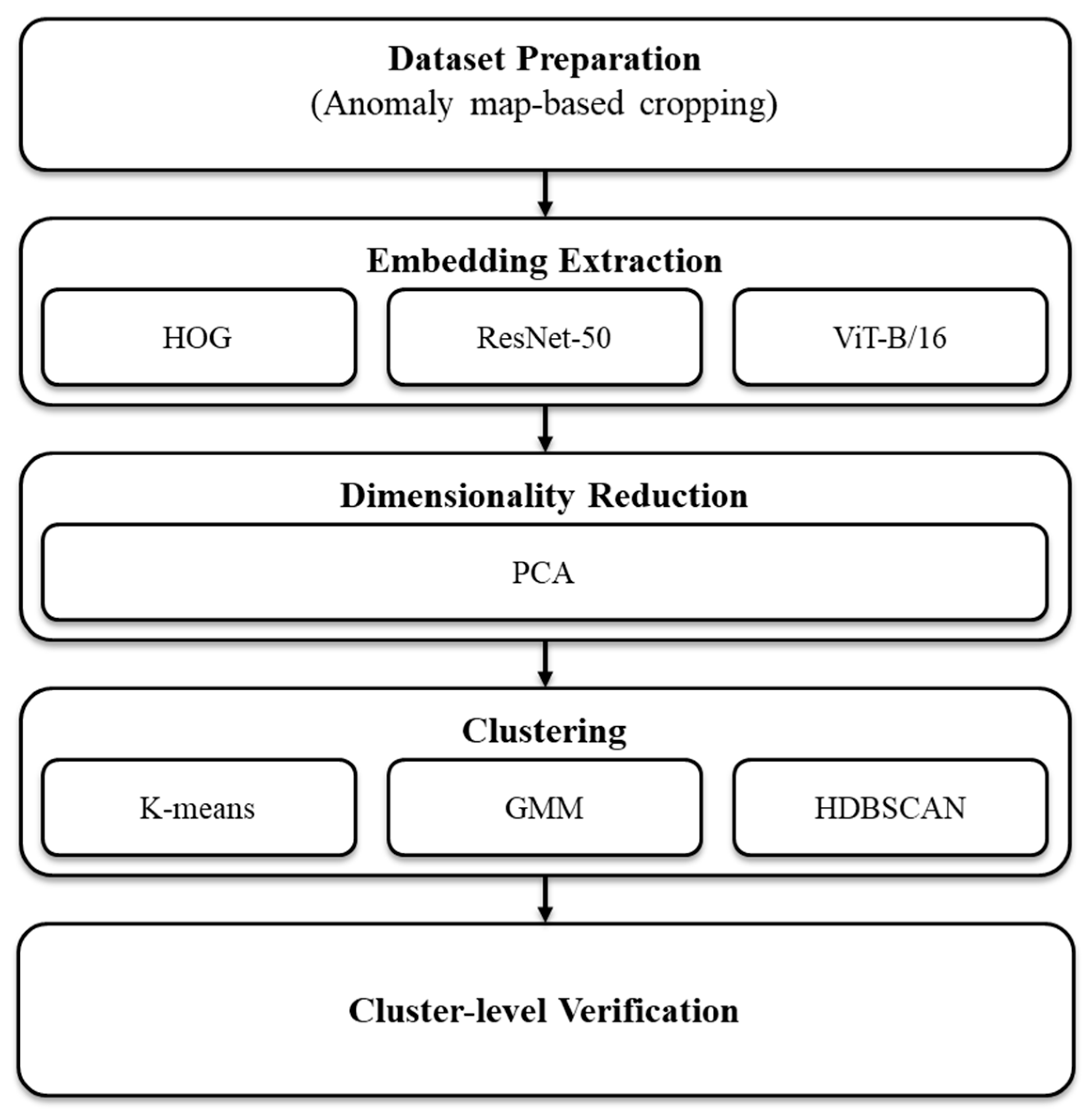 - An end-to-end, production-oriented workflow that connects ROI proposals to batch labels via margin-aware cropping, backbone-agnostic embeddings (Histogram of Oriented Gradients (HOG) [14,15]/ResNet-50/ViT-B/16), auto-configurable clustering (k-means [16,17]/Gaussian Mixture Model (GMM) [18,19]/Hierarchical Density-Based Spatial Clustering of Applications with Noise (HDBSCAN) [20,21]), and cluster-level visualization (top-K montages) for rapid human confirmation was used.