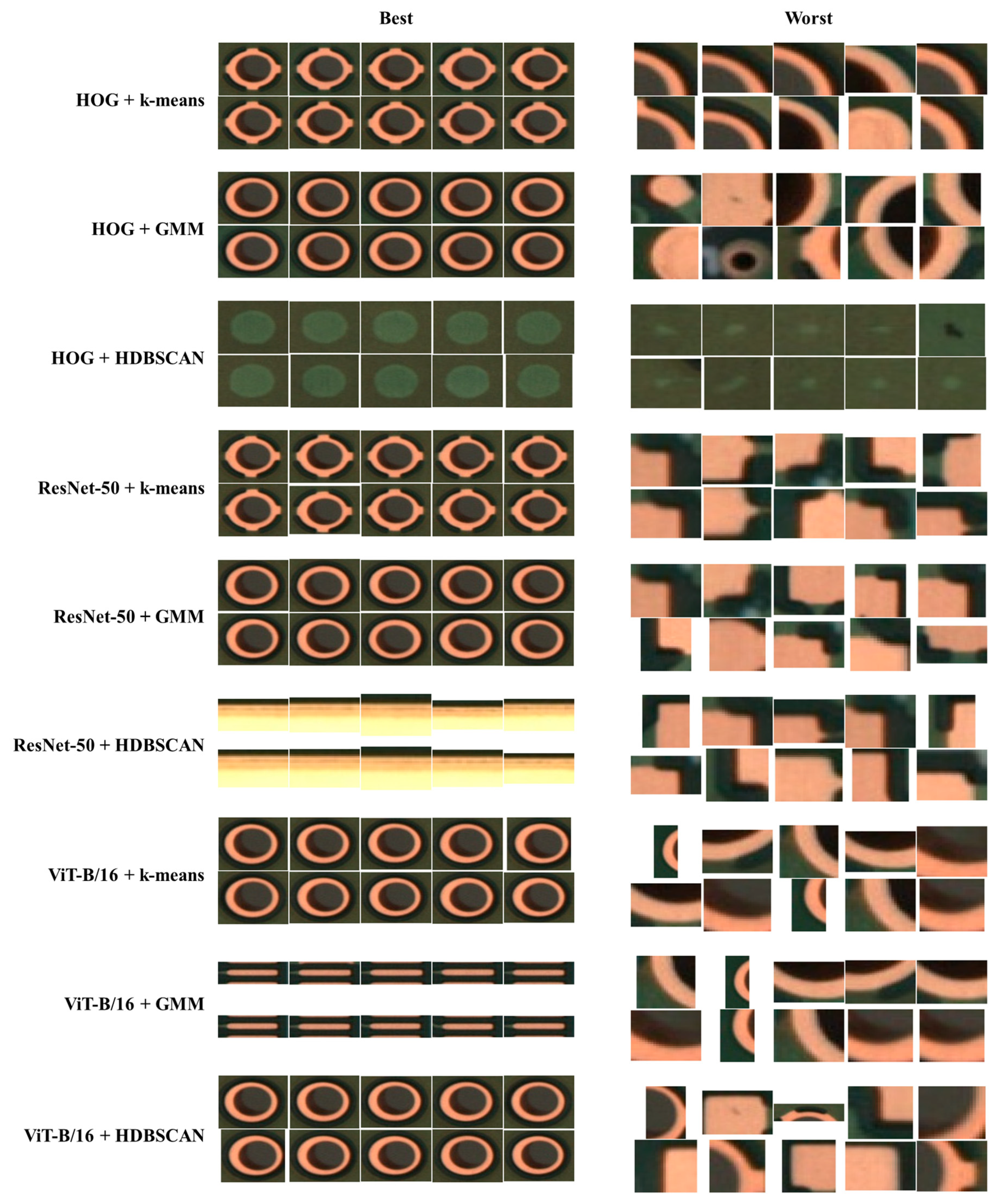 - Overlapping class definitions. Semantic ambiguity between classes, such as Pollution vs. Foreign Particles or Spur vs. Spurious Copper, often led to mixed clusters, even under otherwise stable conditions.