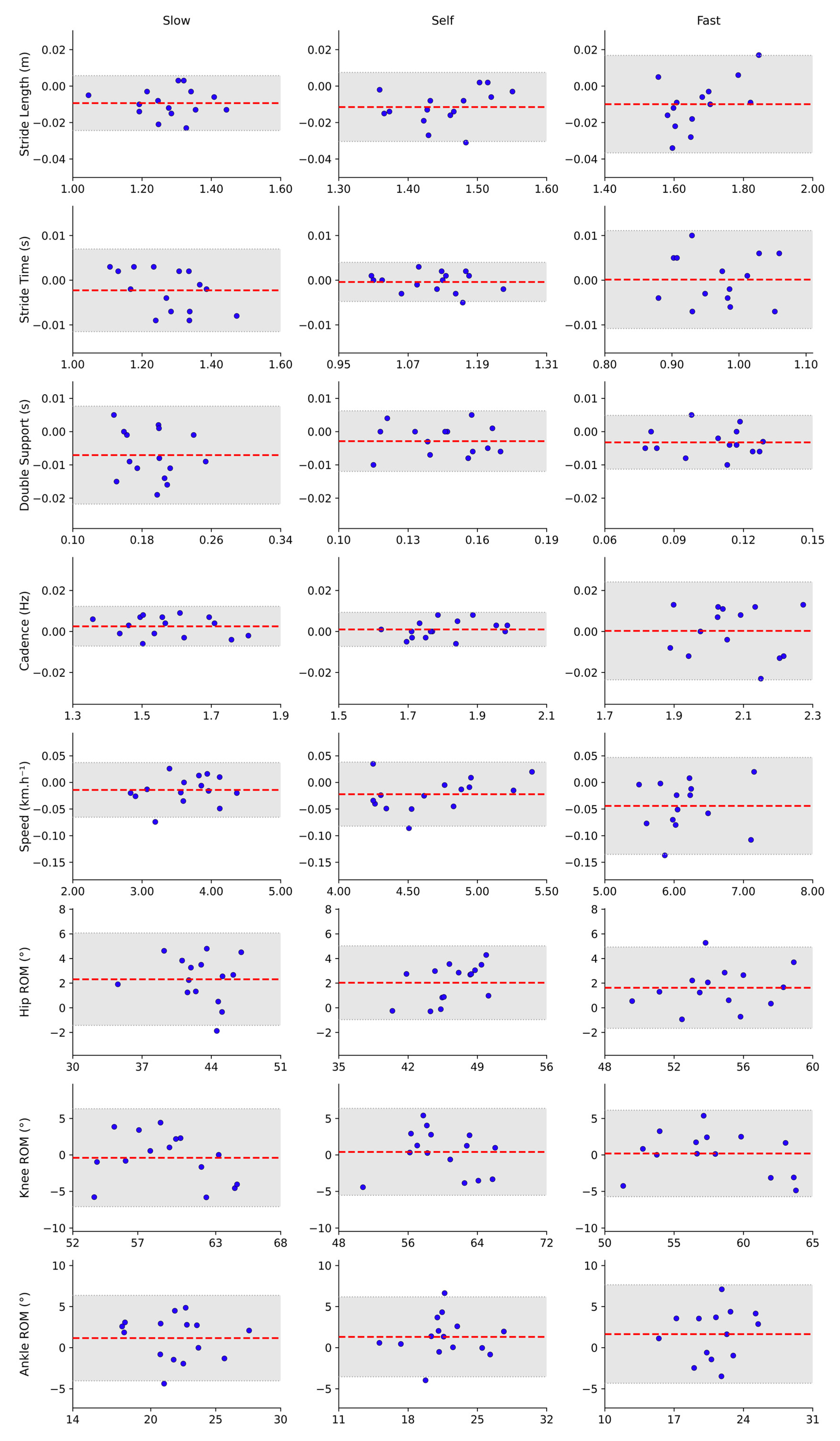 Stride Length (m) | Slow | 1.286 ± 0.103 | 1.276 ± 0.102 | −0.009 (−0.024, 0.006) | 0.993 | 0.997 | 0.015 |