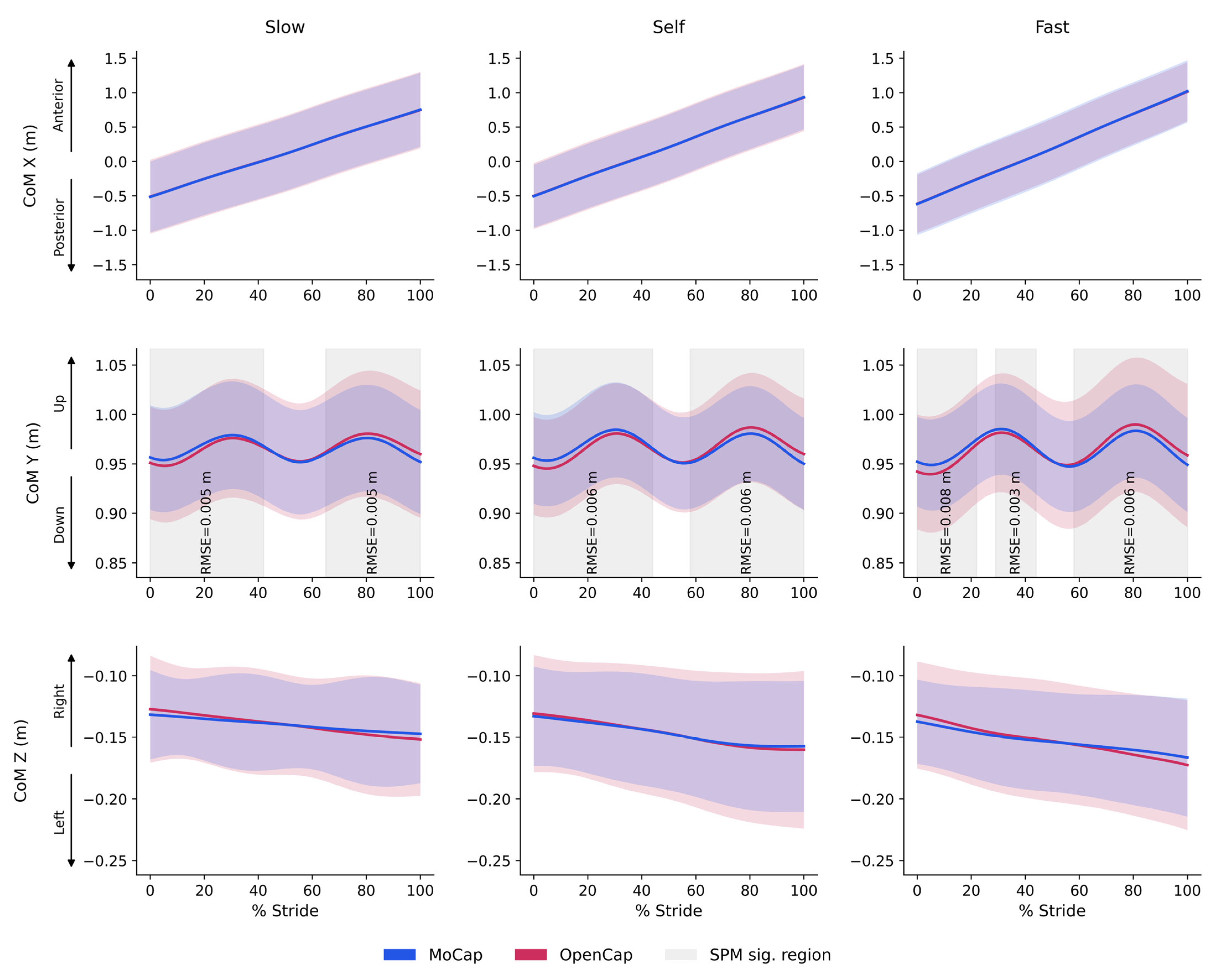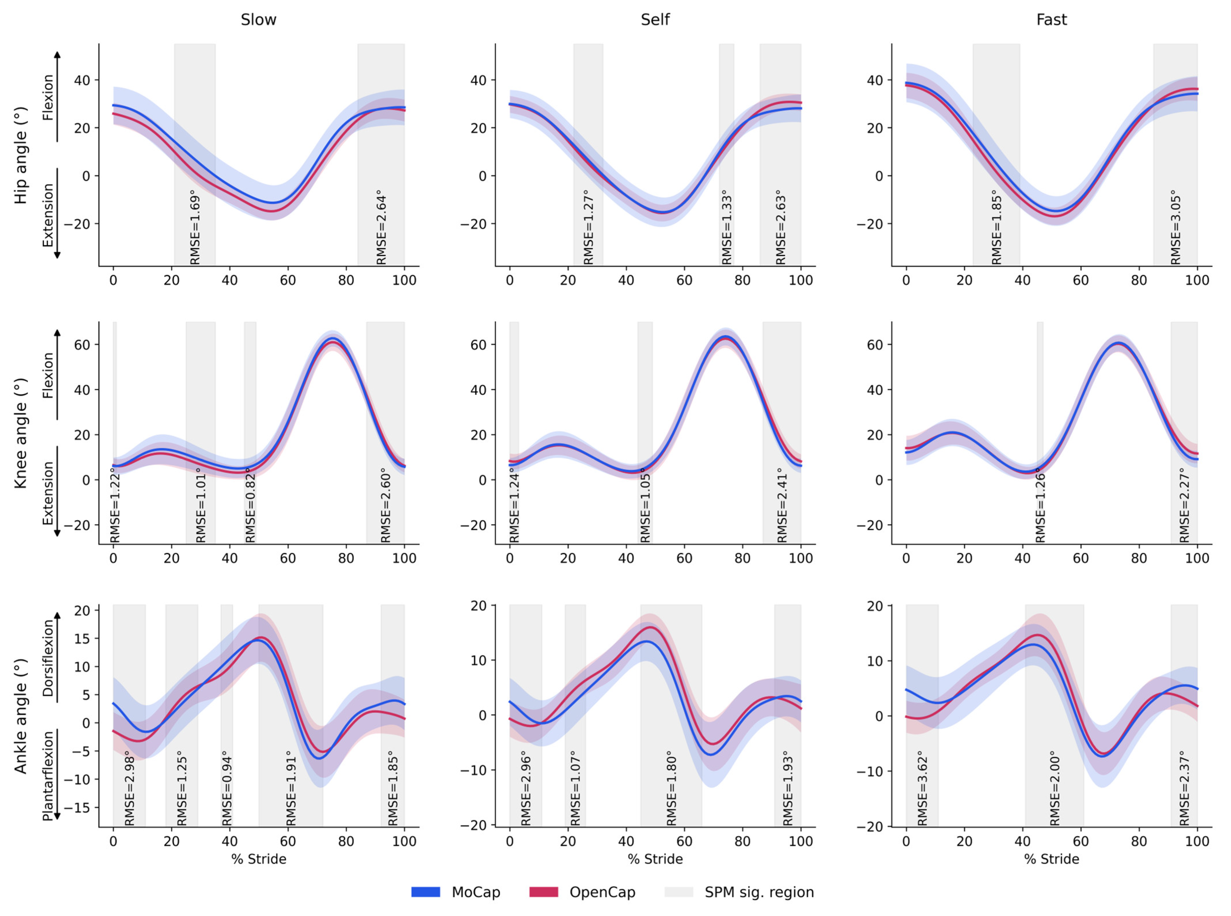- OpenCap showed excellent agreement with MoCap for spatiotemporal gait parameters and continuous joint kinematics across different walking speeds.