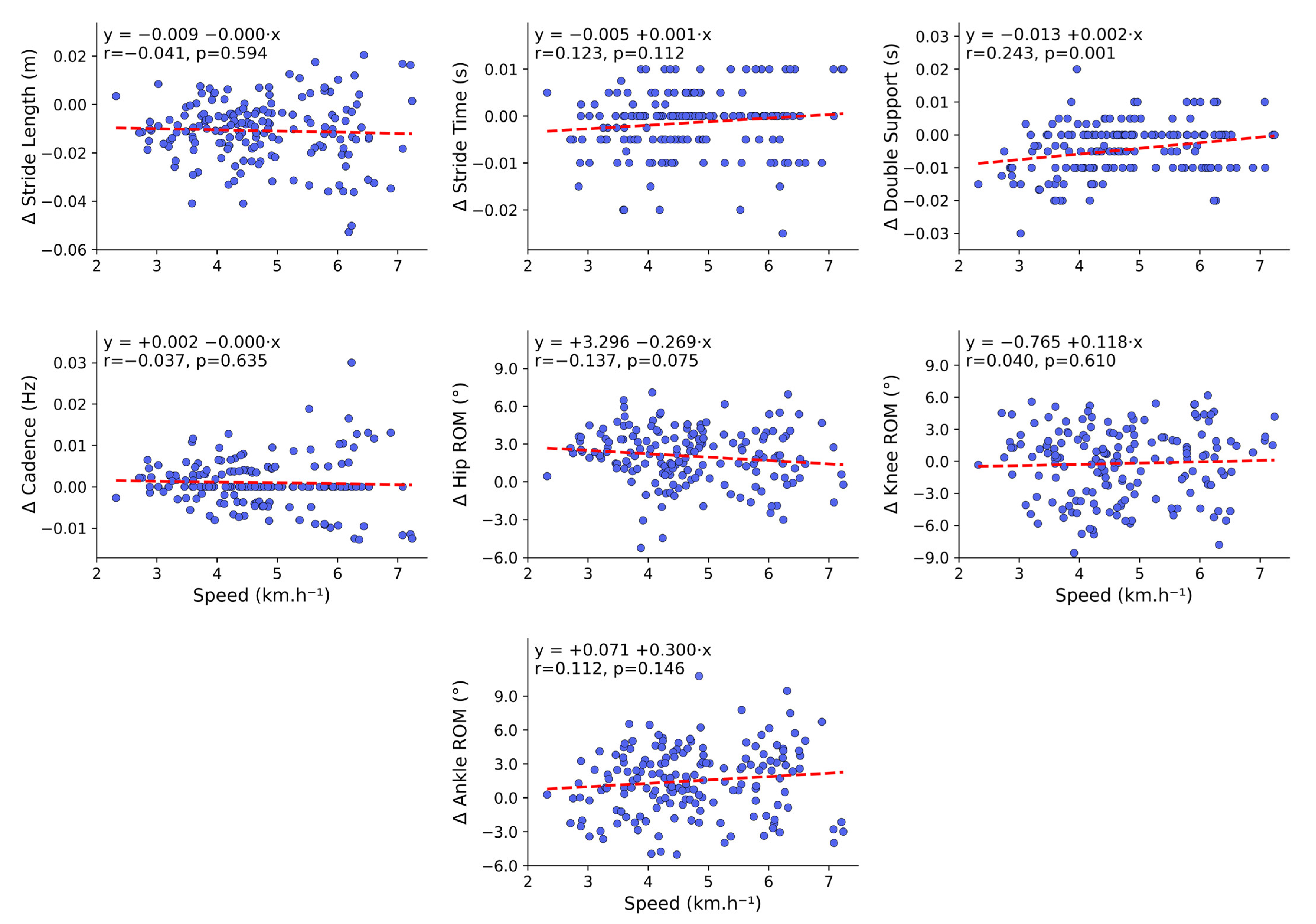 Double Support (s) | Slow | 0.197 ± 0.036 | 0.190 ± 0.034 | −0.007 (−0.022, 0.008) | 0.950 | 0.973 | 0.015 |