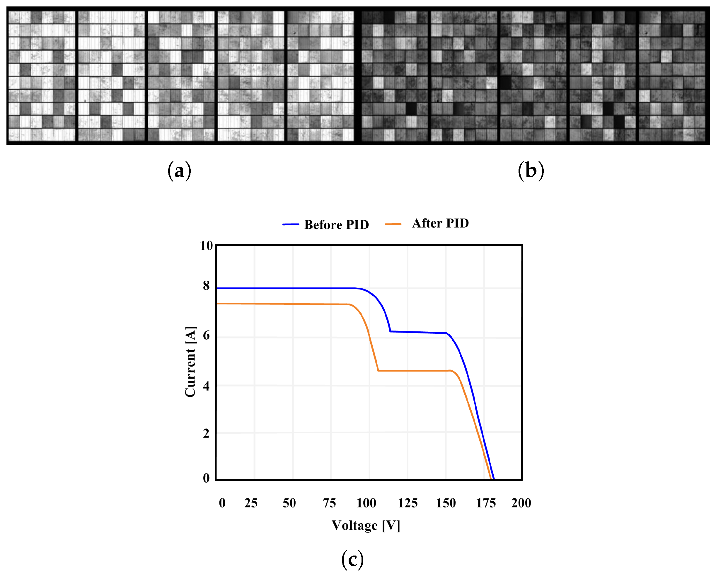 For the experimental validation, a PV array with uniform characteristics was constructed to simulate artificial degradation, which was induced by partially shading selected modules. The resulting P–V curves displayed a decrease in maximum power and additional inflection points; these features were used as the principal basis for degradation assessment. As shown in
