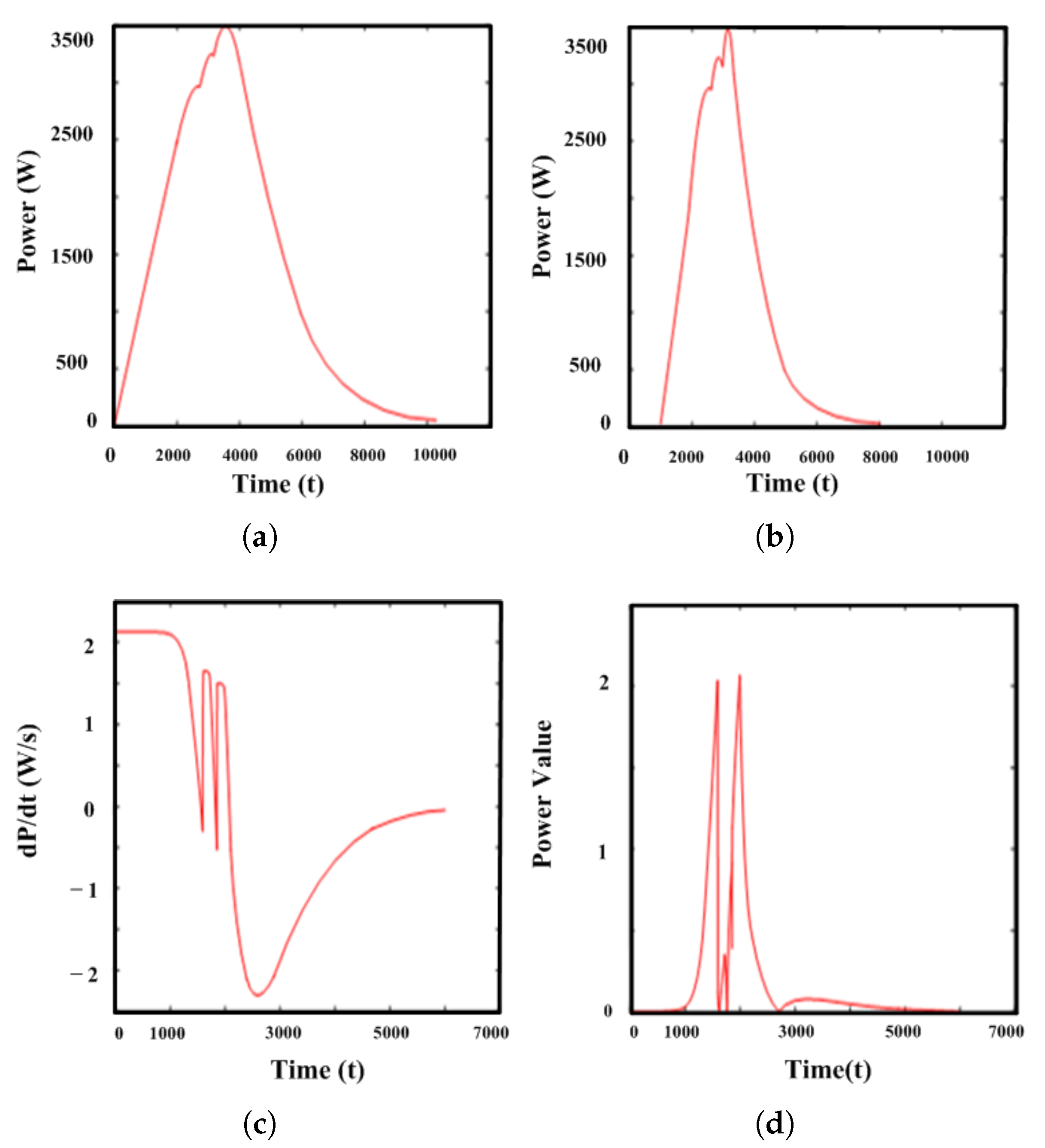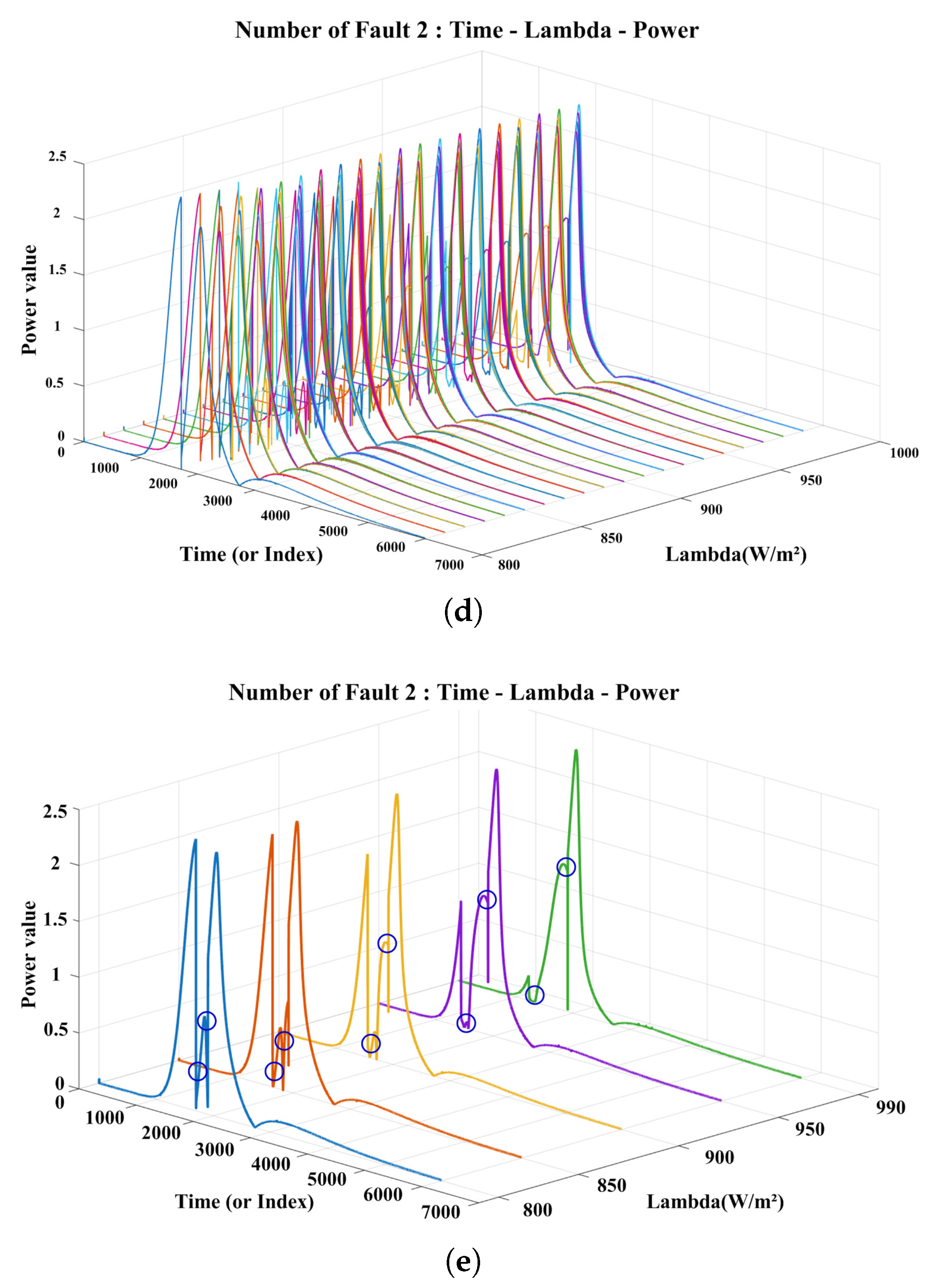 Figure 18b shows the power waveform when a single panel is degraded. All curves exhibit similar inflection points; however, the output amplitude gradually decreases as the lambda value increases. Although the basic shape of the curve remains consistent, differences in the distribution of the output amplitude indicate that the degraded panel influences the overall system output. The inflection point’s amplitude, position, and slope change systematically with the degree of degradation. These attributes serve as sensitive diagnostic indicators of the degradation state.