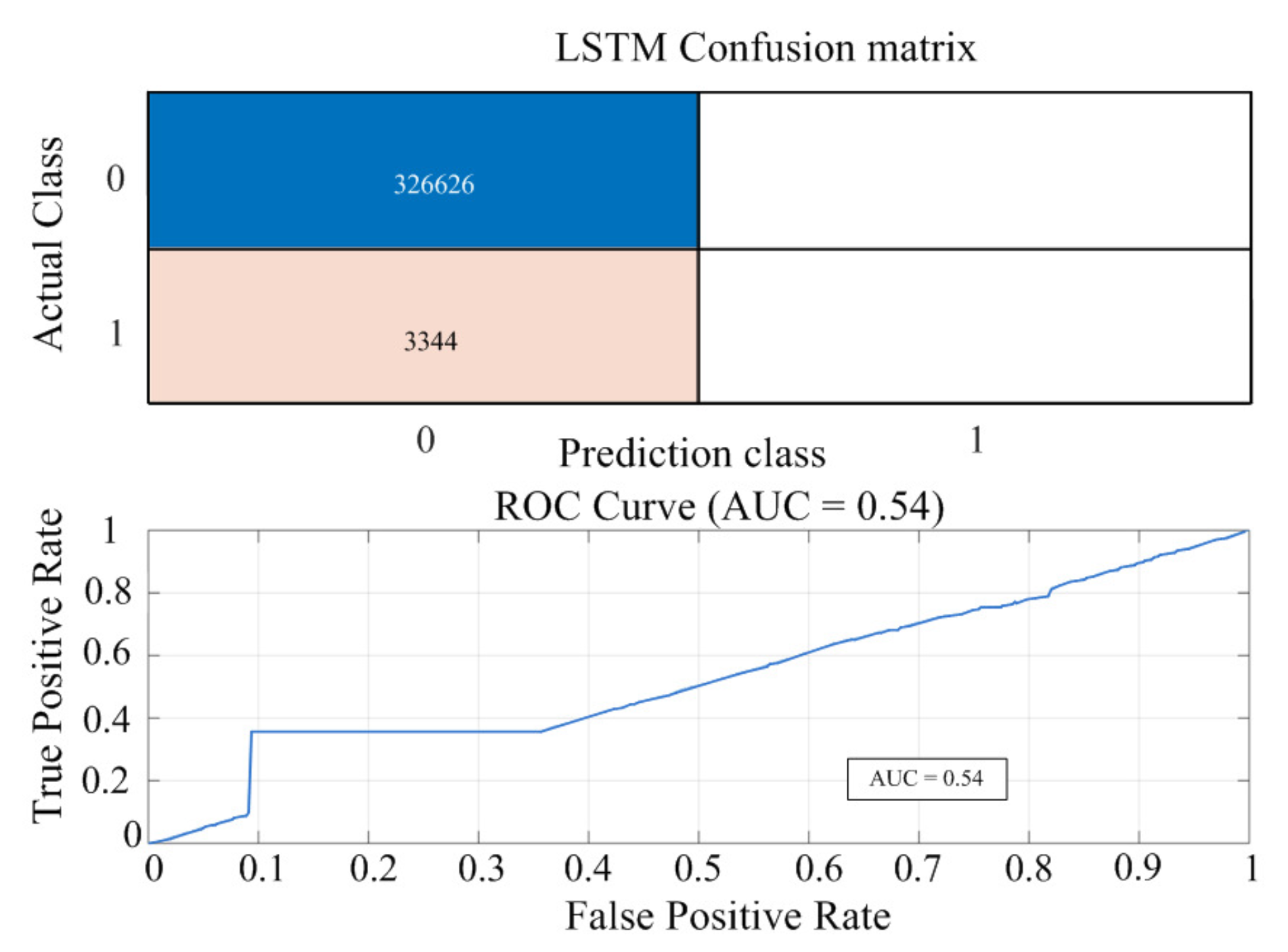 Figure 14 should be viewed not as an absolute performance comparison, but as evidence that the proposed method can detect abnormal patterns to a meaningful degree even under extreme class imbalance. Random forest achieved a higher AUC, but its memory footprint and inference latency limit real-time deployment. In contrast, the proposed shallow LSTM was selected as the final model for its deployability and scalability to long, multichannel time-series data and amenability to lightweighting, quantization, and hardware acceleration.