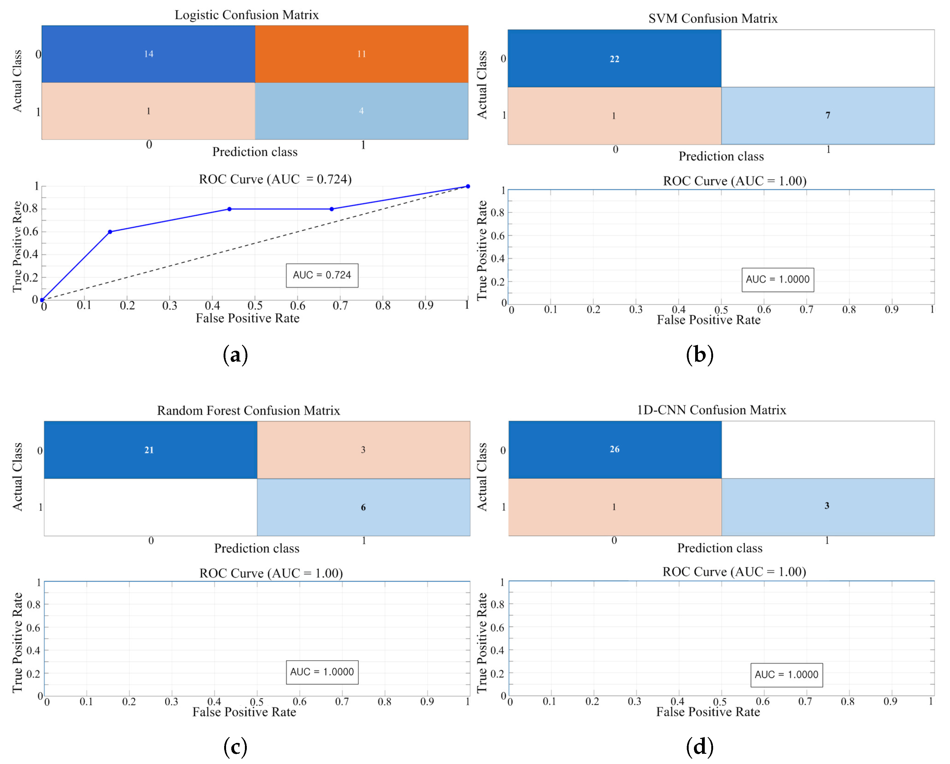 Figure 16 presents the confusion matrices and ROC/AUC curves for the four baseline models—(a) Logistic Regression, (b) SVM, (c) Random Forest, and (d) 1D-CNN—while