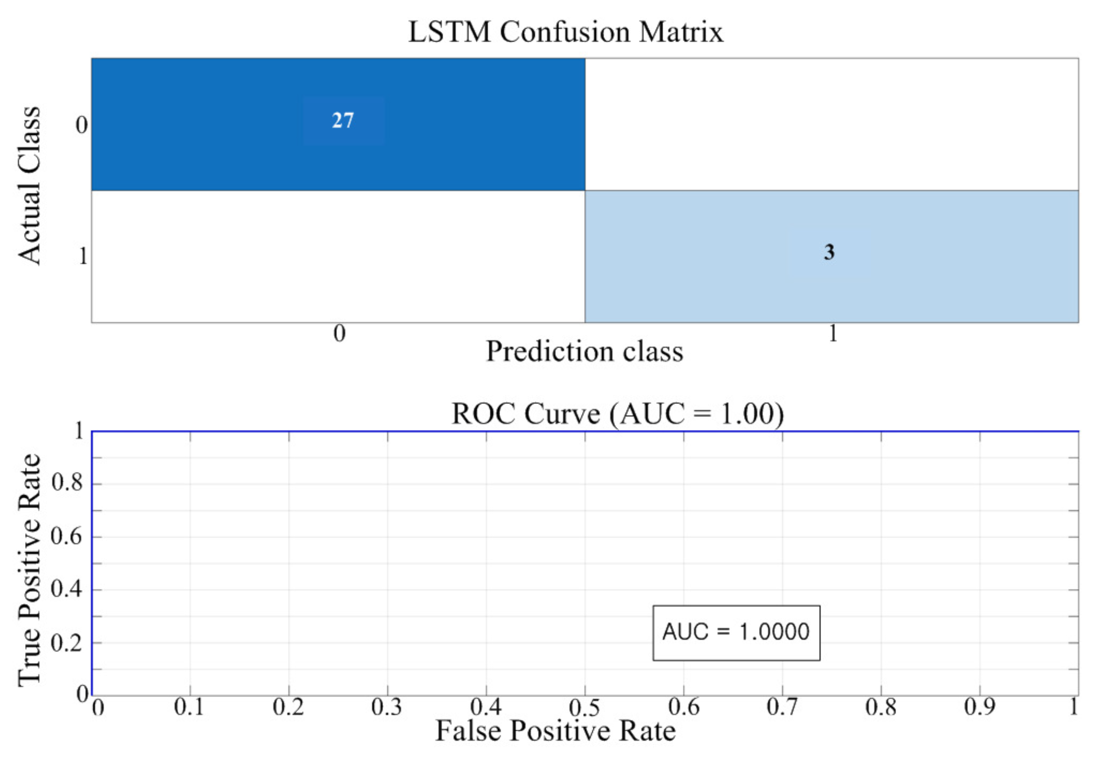 Figure 16d). The proposed LSTM achieved AUC = 1.00 and training/test accuracies of 100.0%/100.0%; in the confusion matrix, it correctly classified all 27 normal and 3 degraded samples (