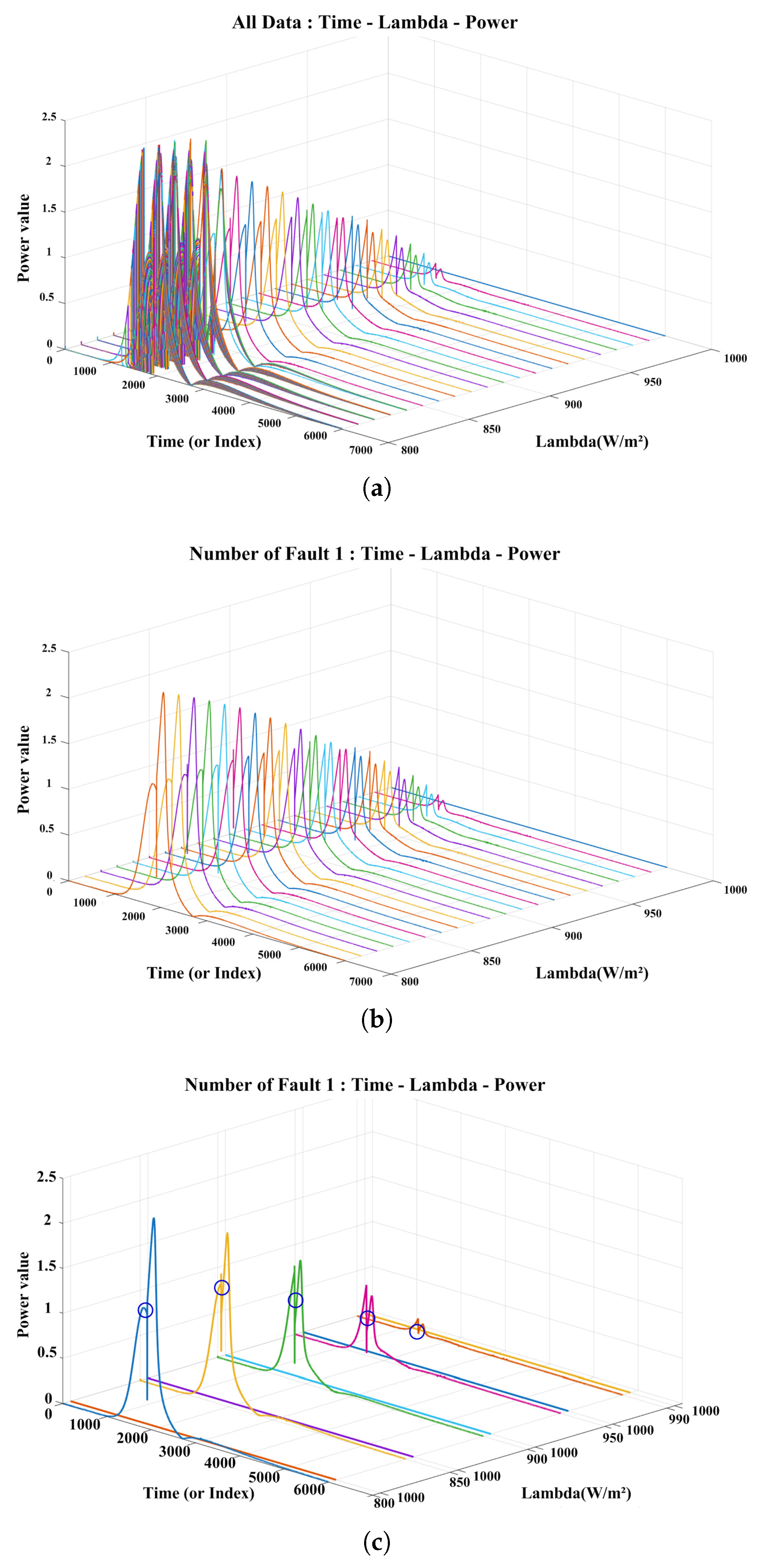 Figure 18a shows the visualization results for the entire dataset, with time, lambda, and power as the axes, providing a visual representation of how the normal and degraded states are distributed across the full lambda spectrum. A noticeable pattern of decreasing output along the time axis is observed, which can be interpreted as the effect of degradation factors such as increased resistance or current loss within the string.