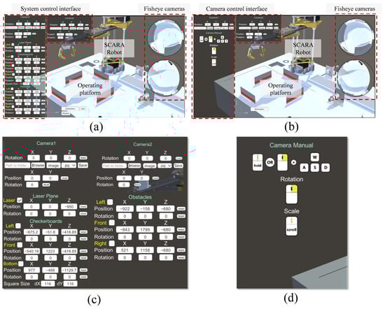 In real-world settings, building an omnidirectional vision testbed requires substantial investment in equipment, installation, and training. By contrast, a virtual environment eliminates expensive hardware and dedicated floor space, while mitigating safety risks. Our simulation system aims to provide an economical, reliable platform for testing omnidirectional vision concepts and accelerating their validation. Compared with traditional physical platforms, our virtual simulation system offers a simpler setup process, faster response time, and lower hardware requirements for the host computer. The multi-view omnidirectional vision simulation system presented in this paper is built on the Unity3D platform and operates on Windows, supporting diverse testing scenarios across different simulated environments. The components of the virtual platform are illustrated in Figure 1. Figure 1a depicts the experimental module, where users can conveniently and efficiently modify the parameters of instruments such as the fisheye camera, laser plane, calibration board, and obstacles via a custom-designed user interface. The right side of the interface displays real-time images captured by the fisheye camera. Figure 1b shows the dynamic adjustment module for the virtual fisheye camera, where users can interactively modify camera parameters such as resolution and field of view (FOV) using mouse controls. In this study, the FOV of the virtual fisheye camera is set to .